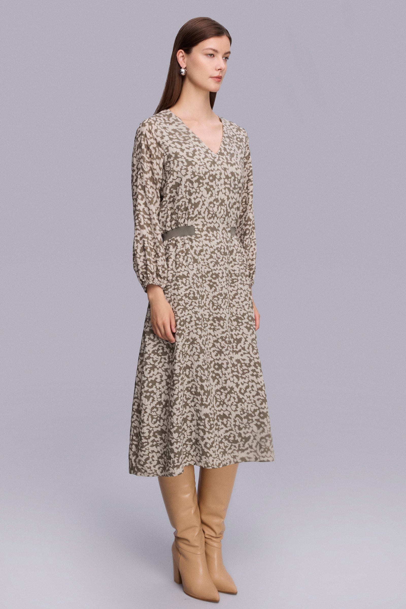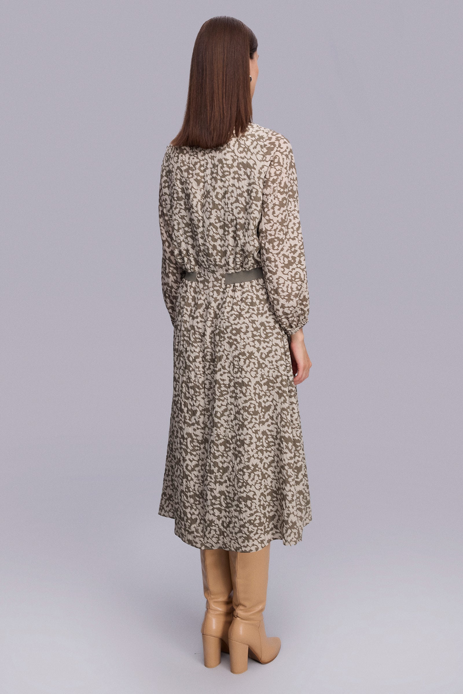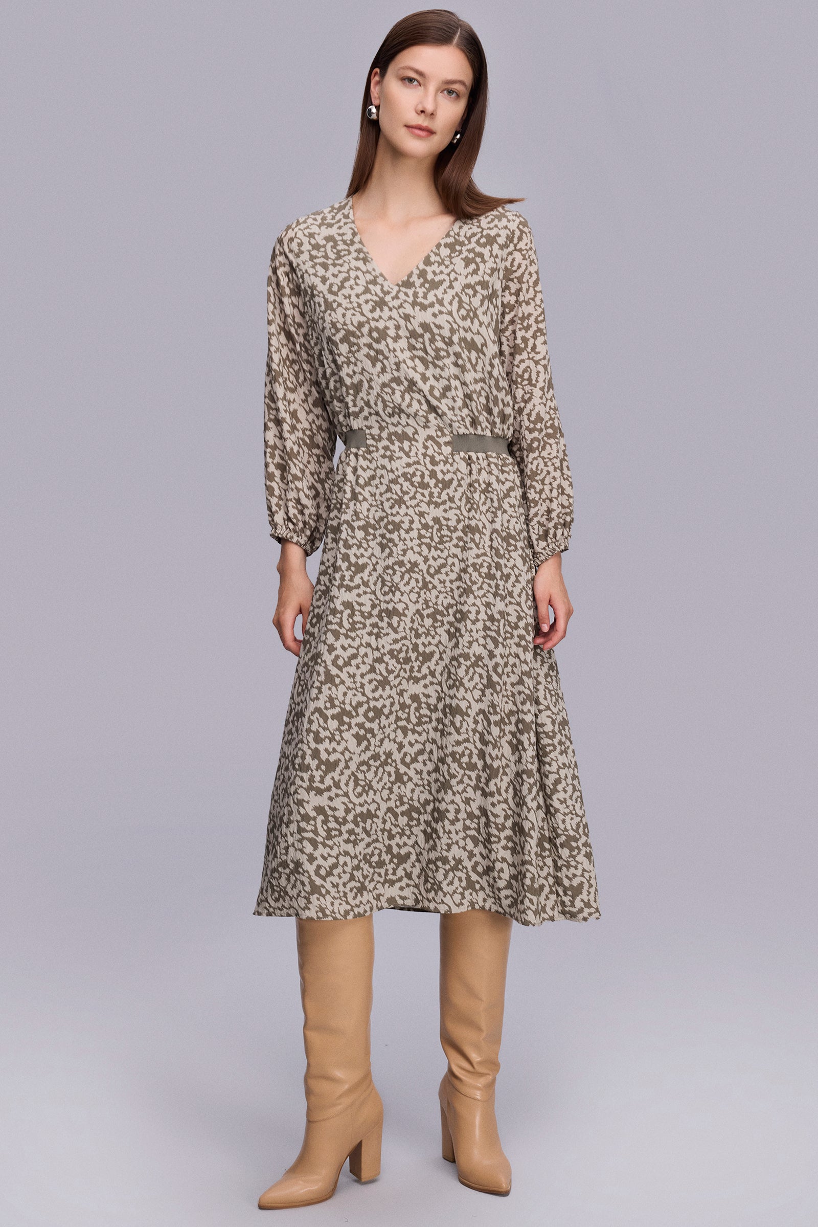 Beli Lastik Detaylı Desenli Midi Boy Elbise