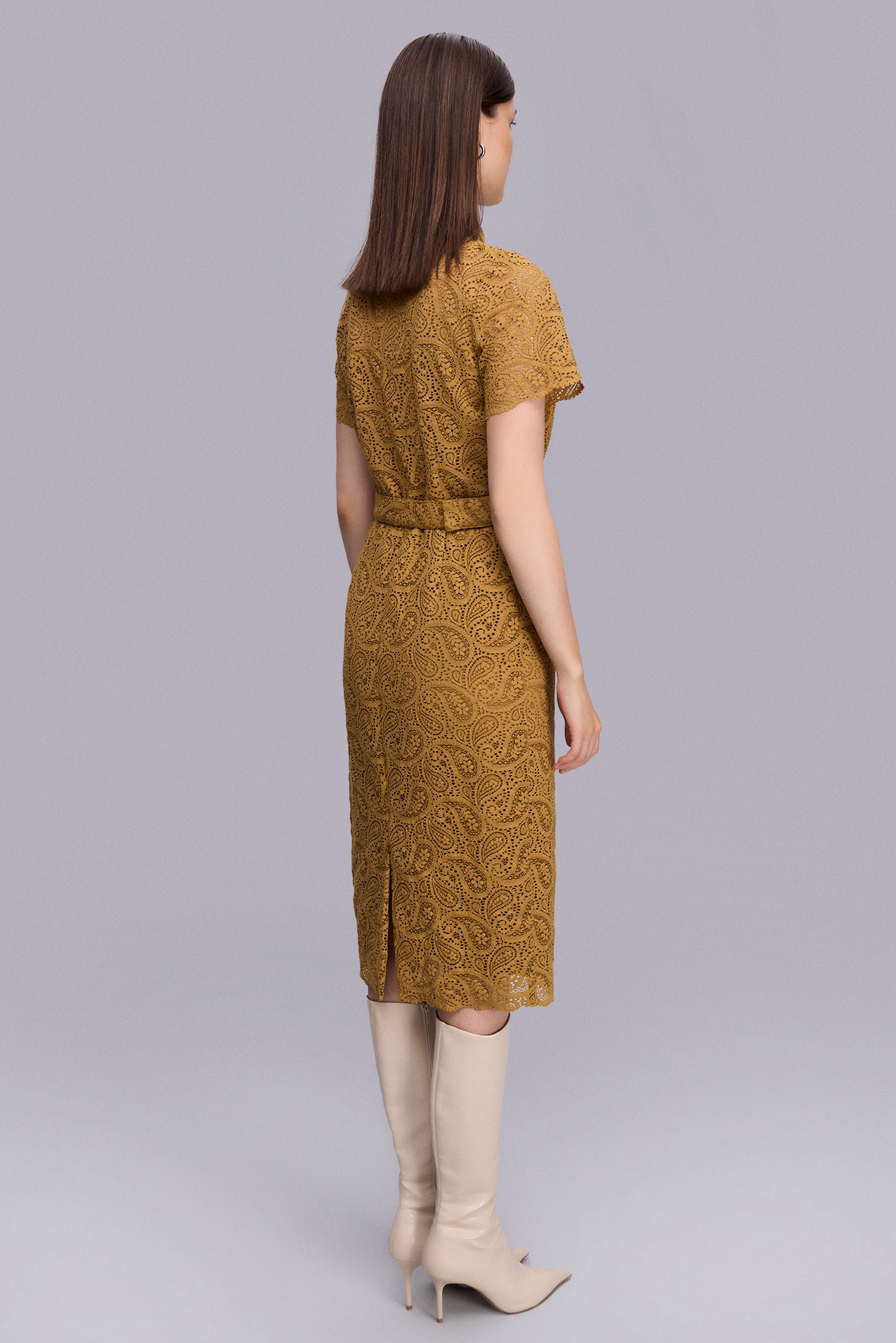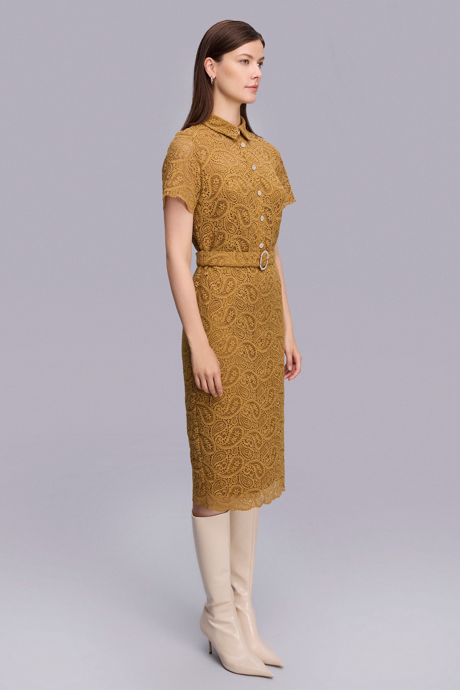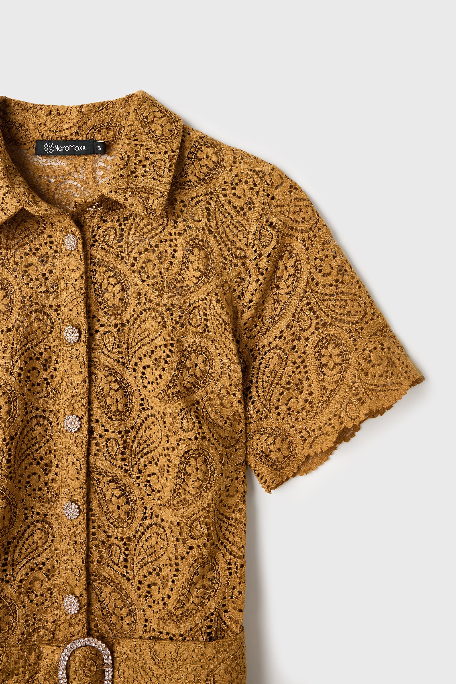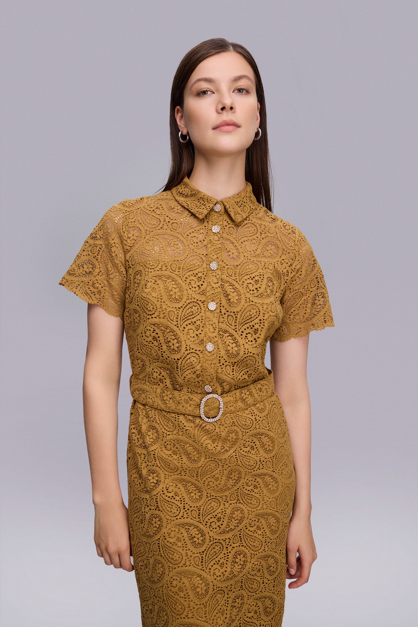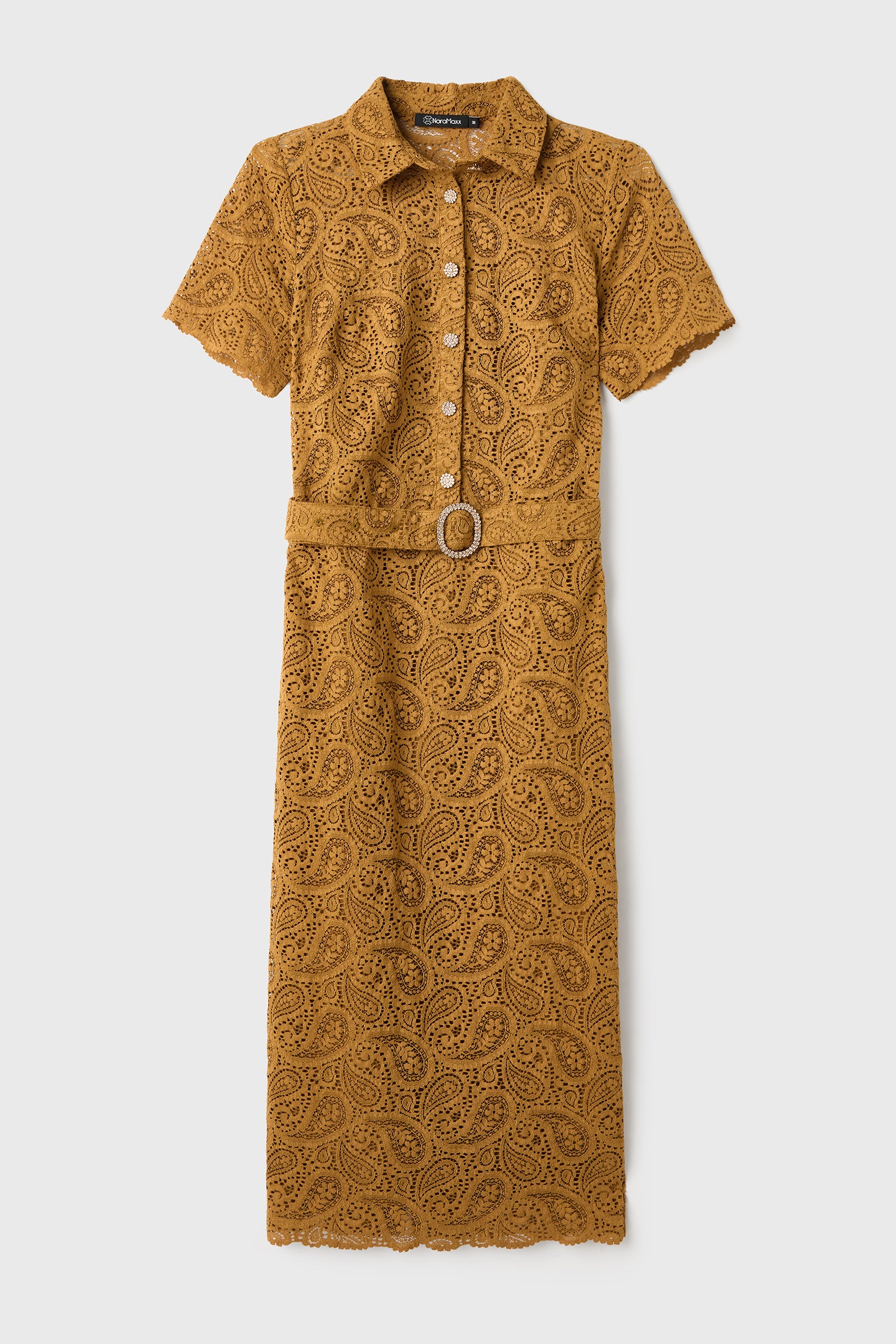 Taşlı Düğmeli Midi Boy Dantel Elbise