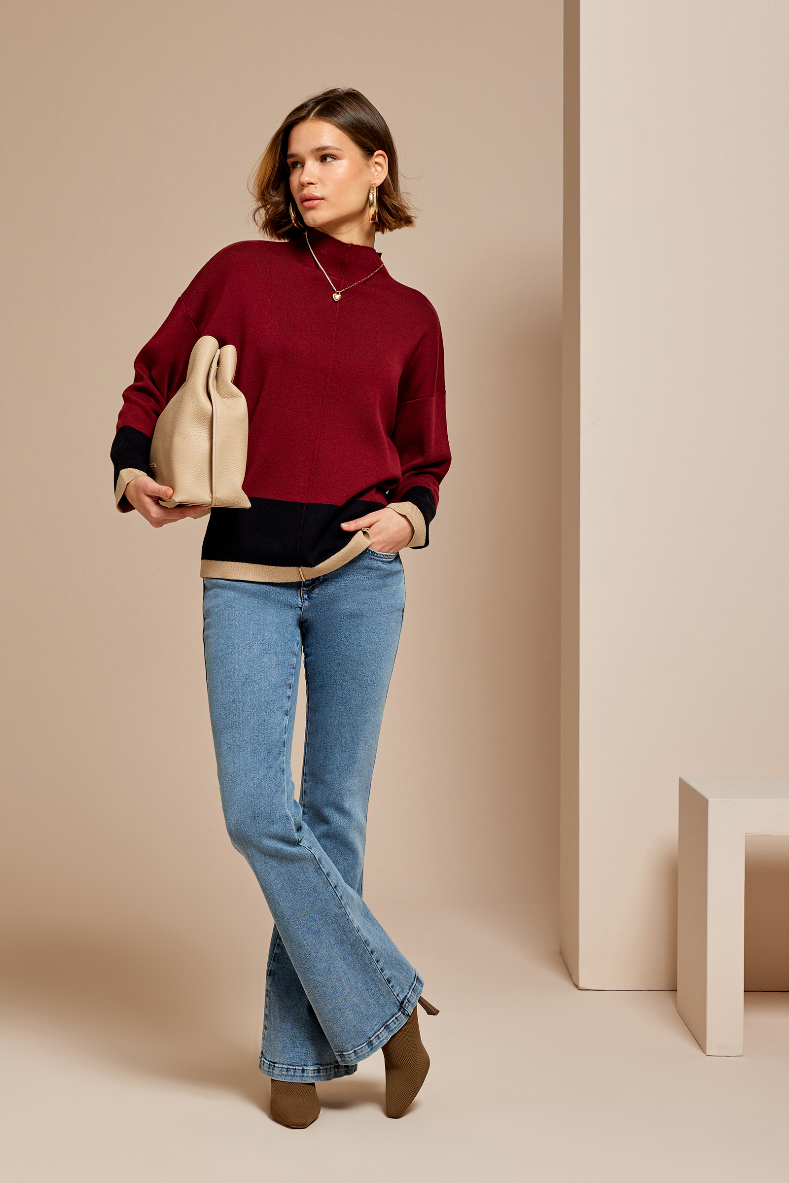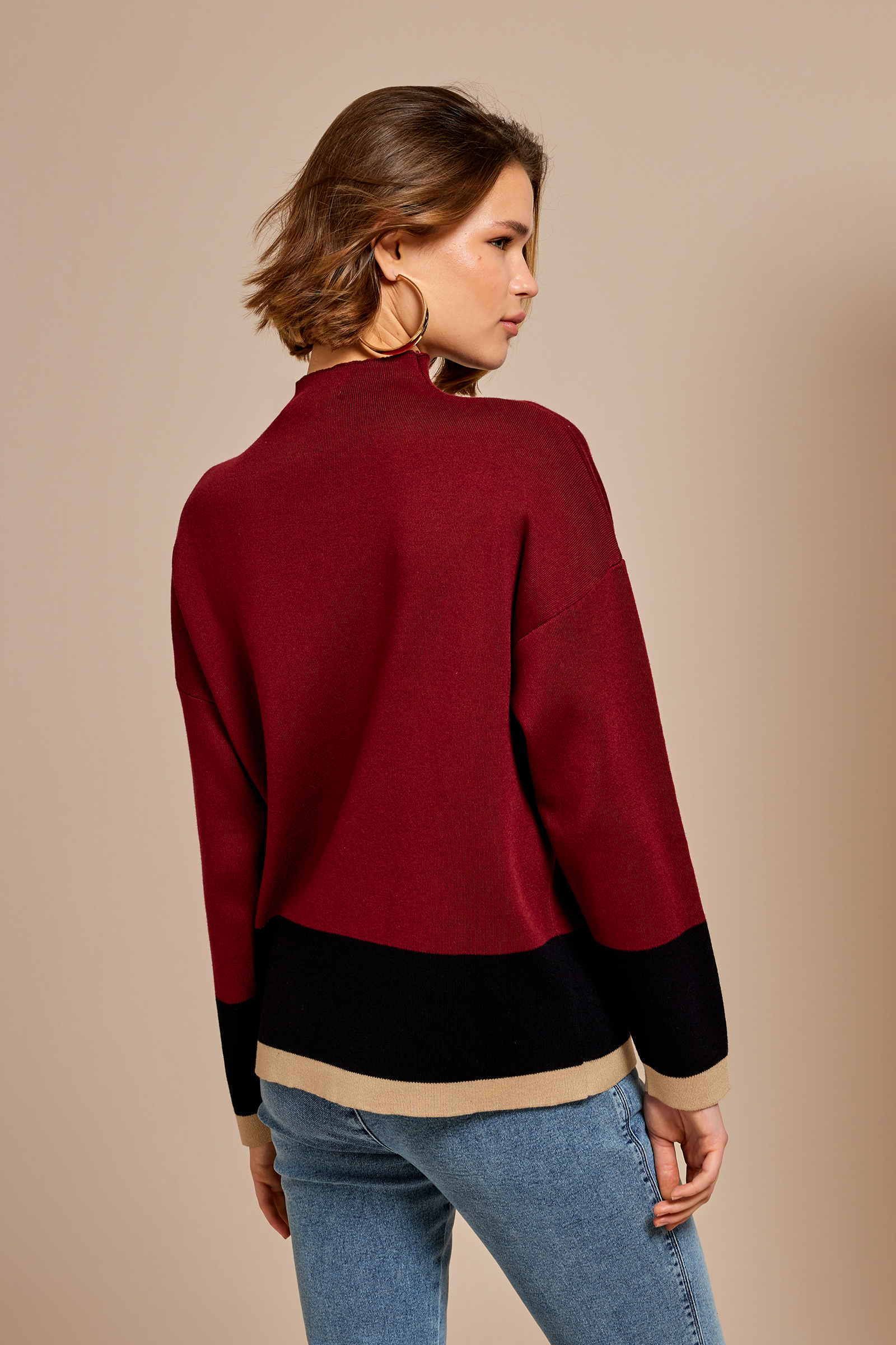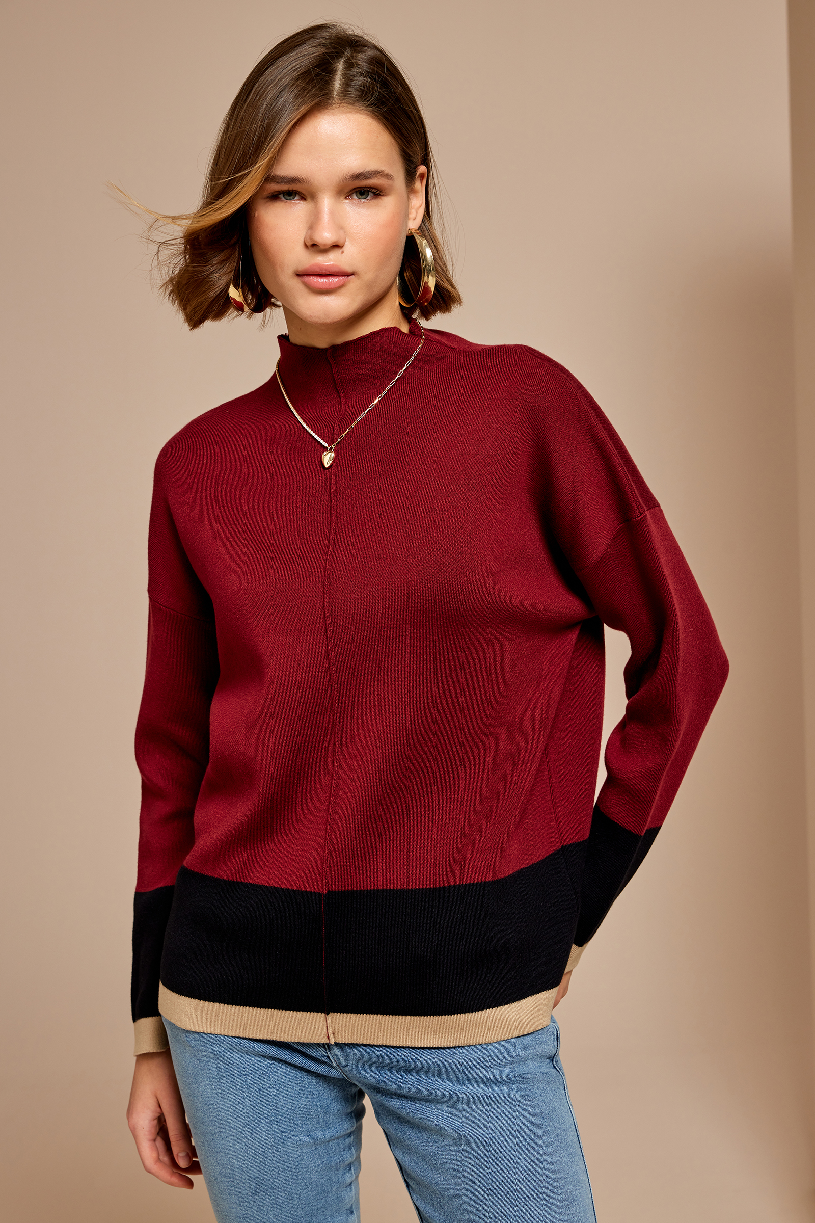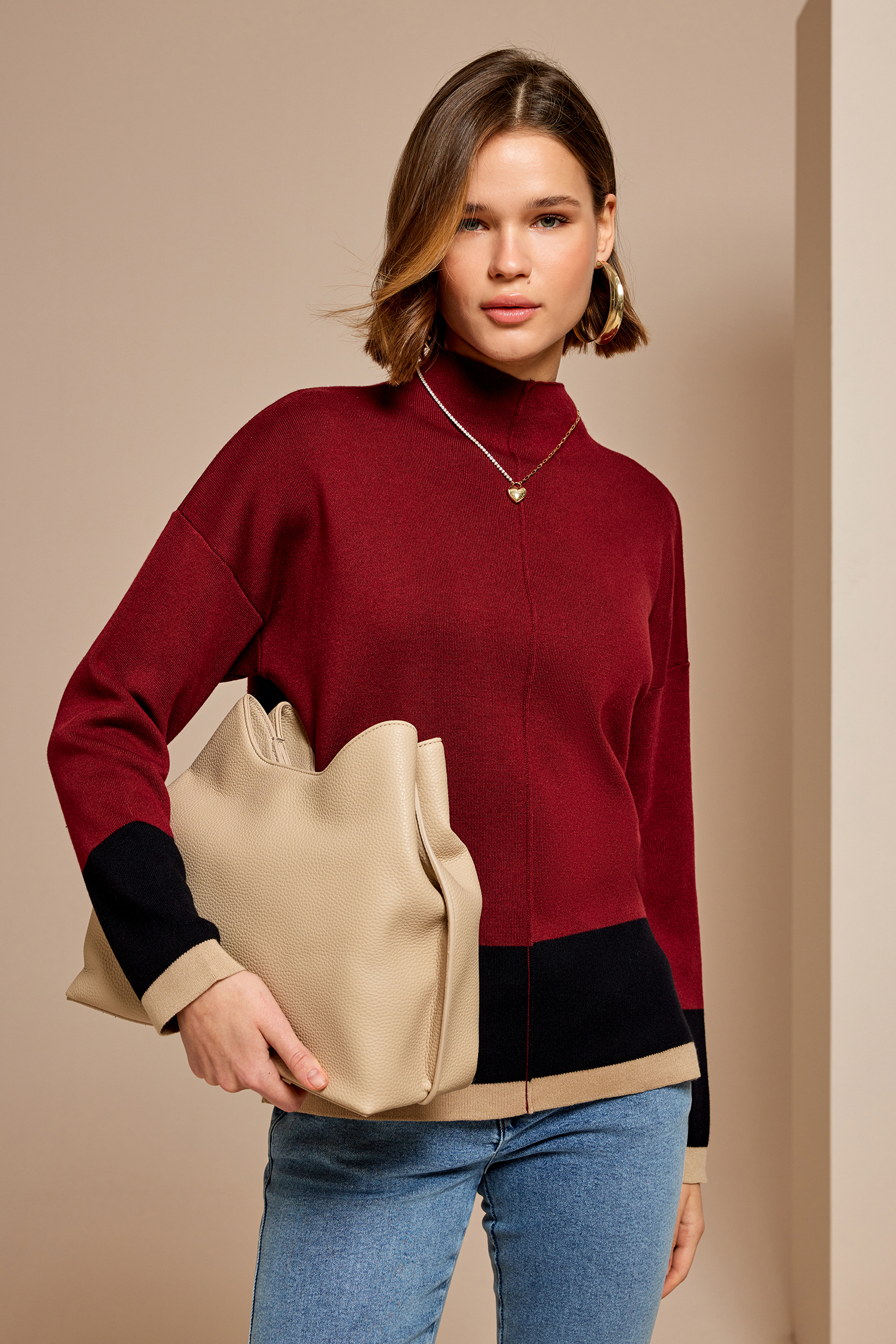 Kontrast Dik Yaka Triko Kazak