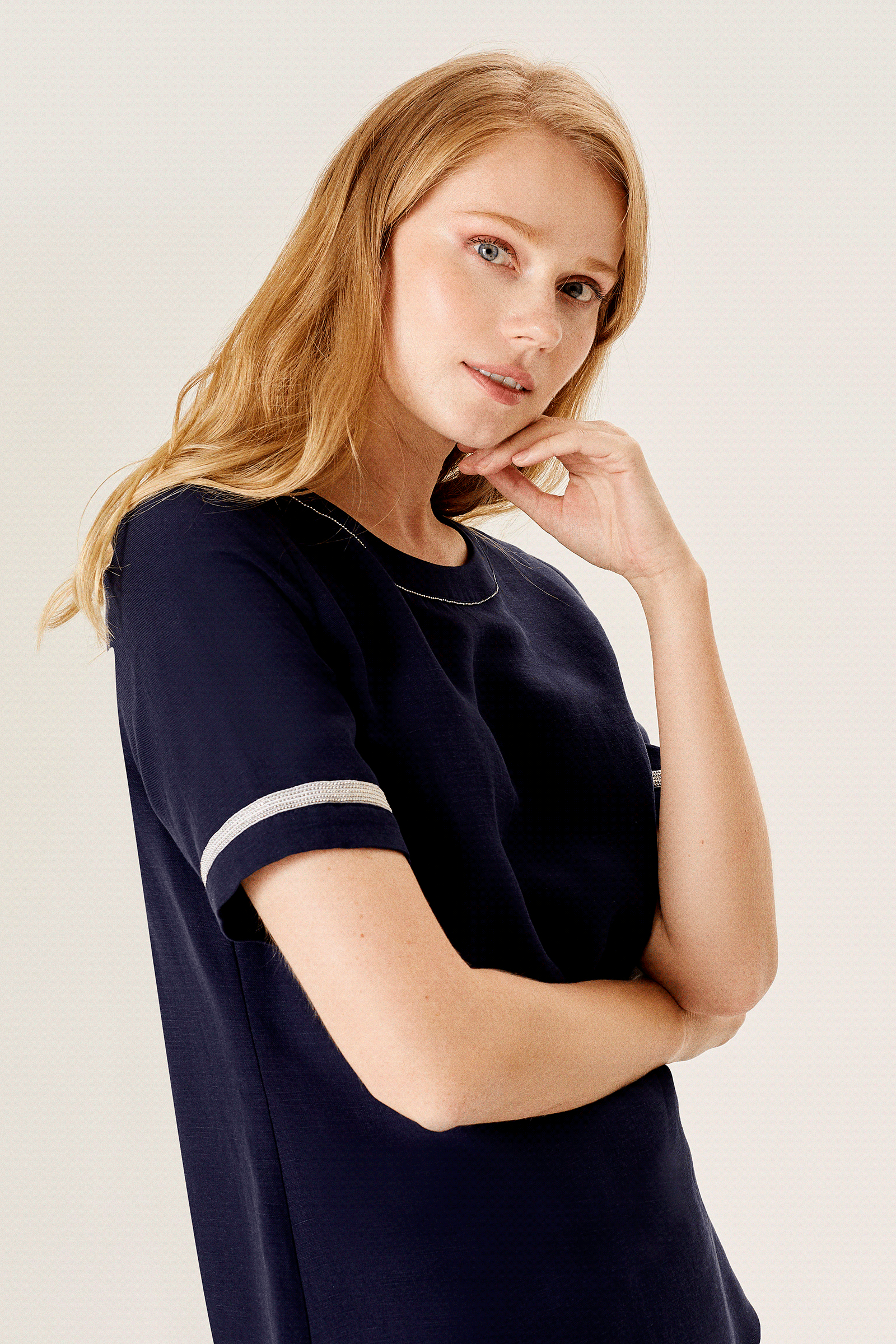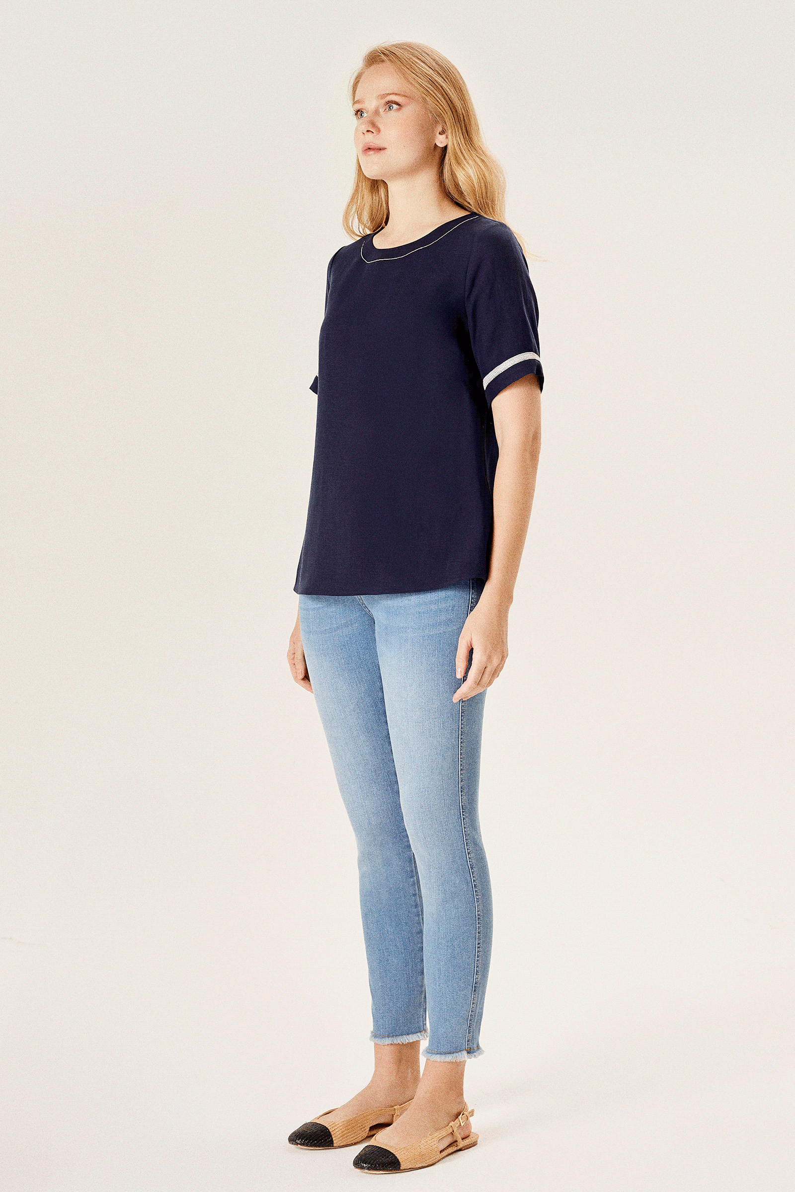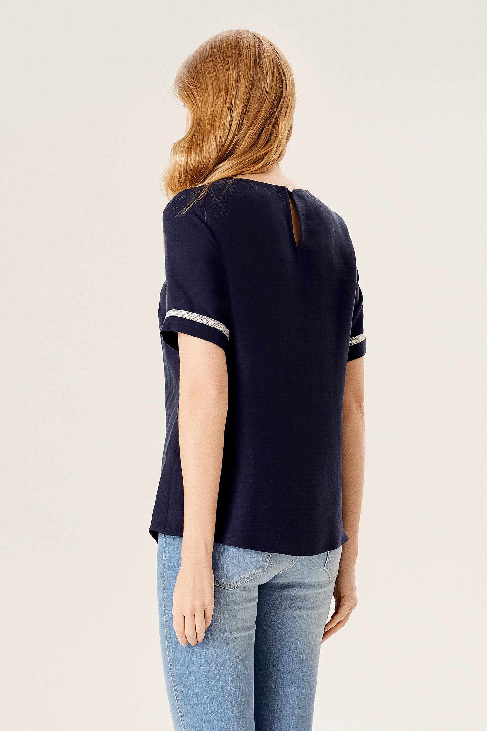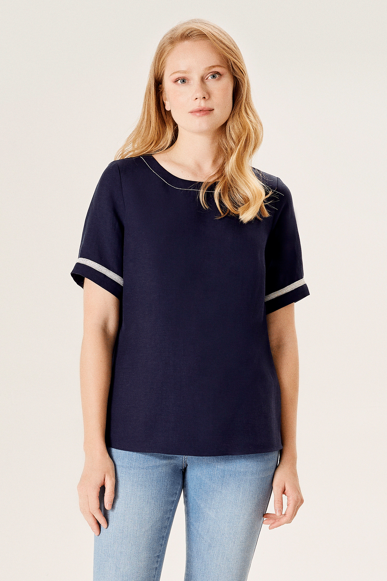 Zincir Aksesuarlı Yarım Kollu Keten Karışımlı Bluz