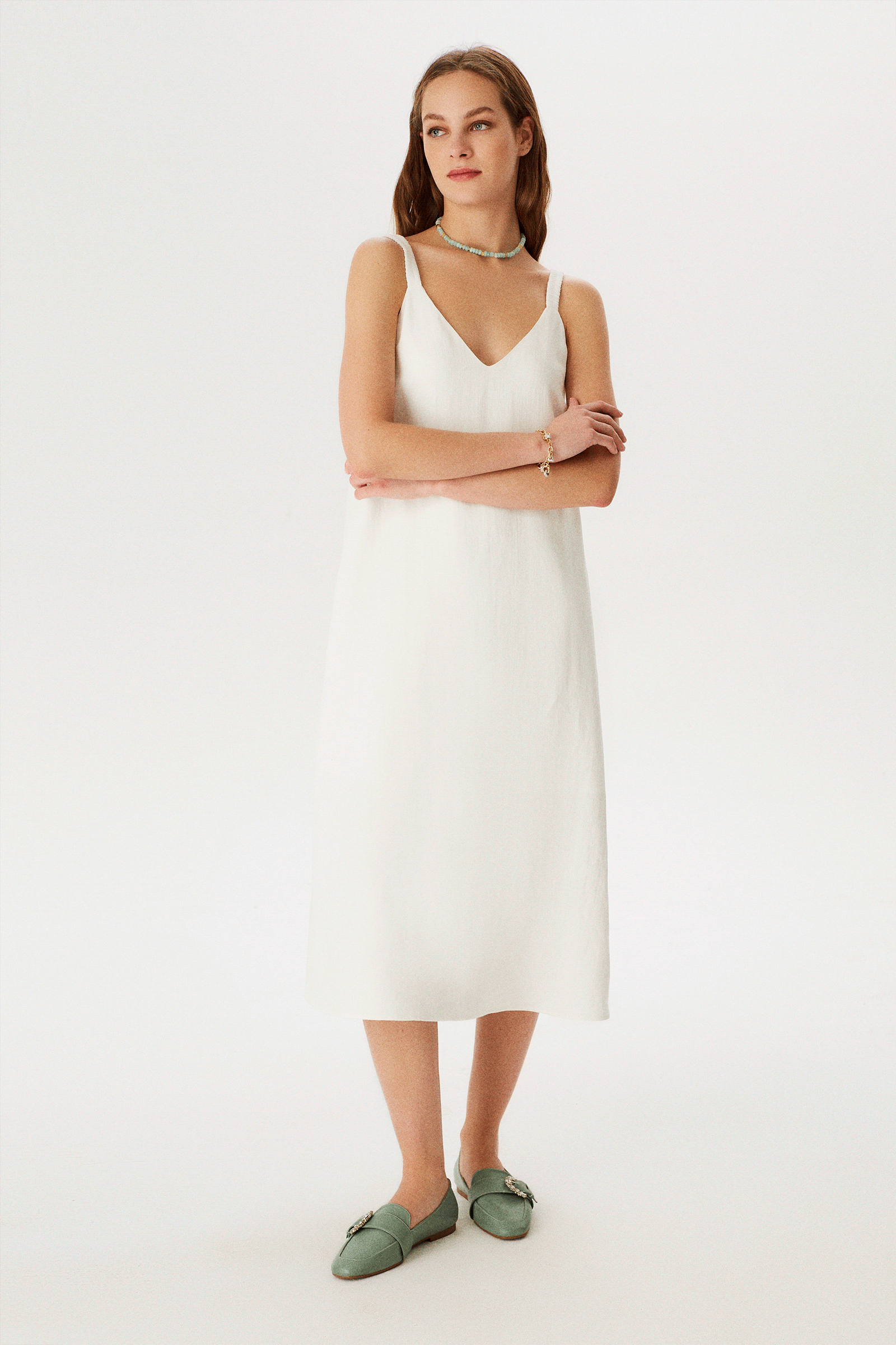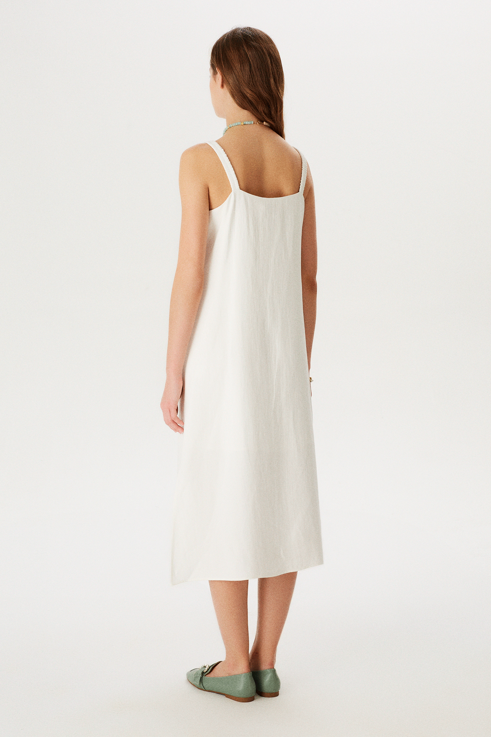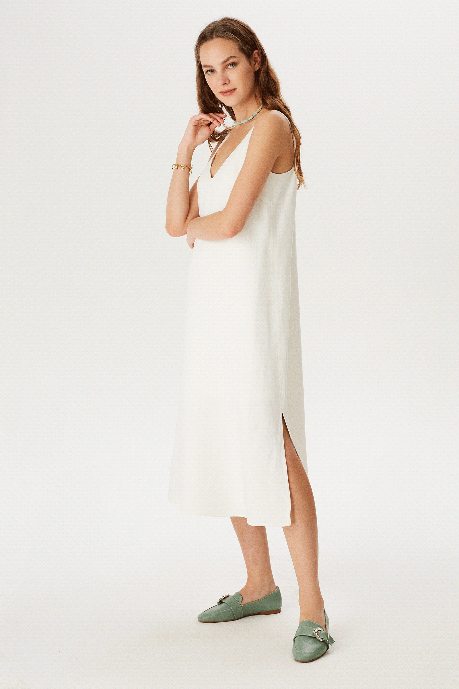 Askıları Lastik Detaylı Yırtmaçlı Midi Boy Elbise