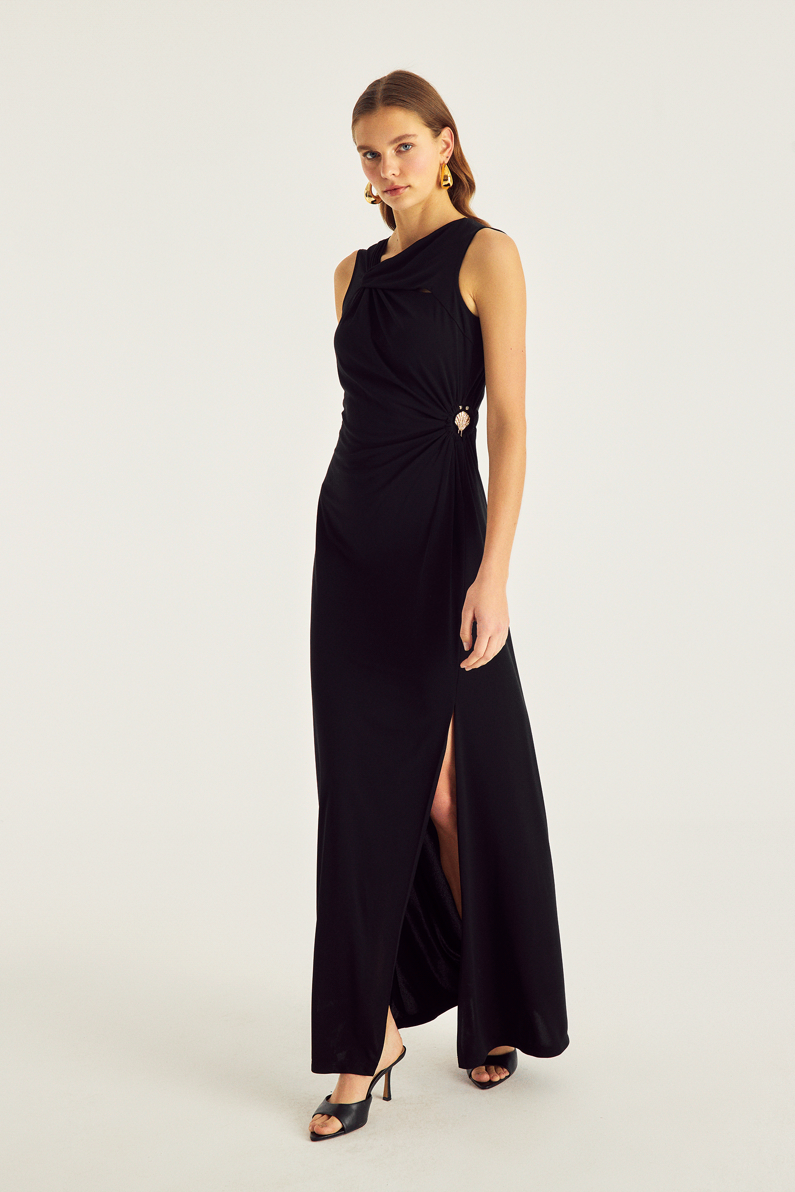 Aksesuar Detaylı Yırtmaçlı Şık Maxi Boy Elbise