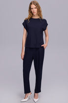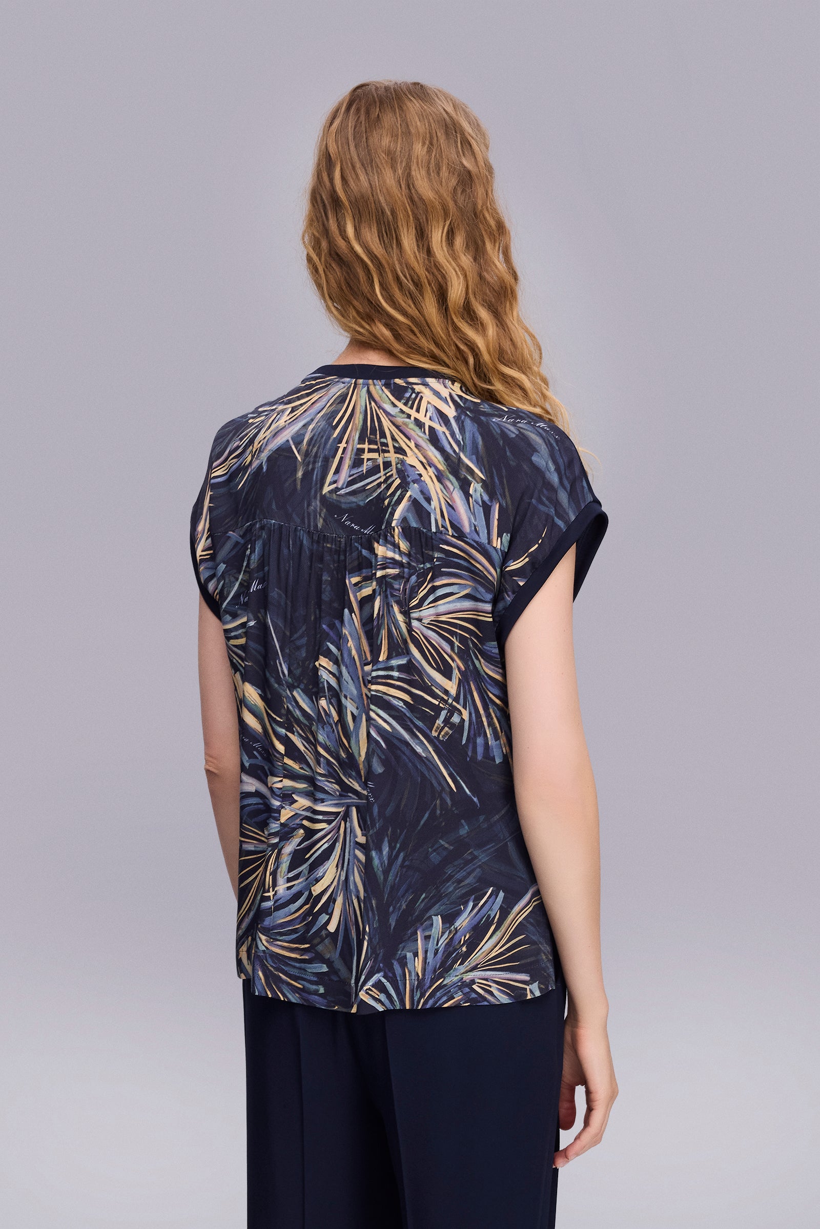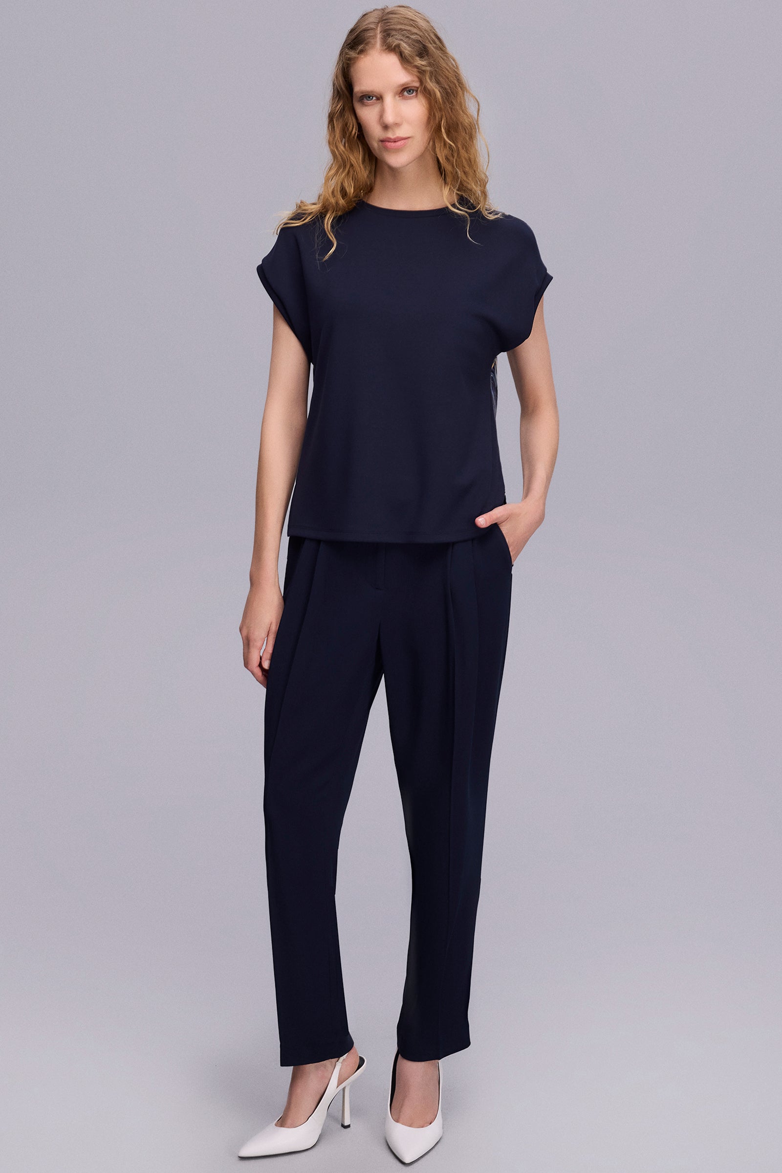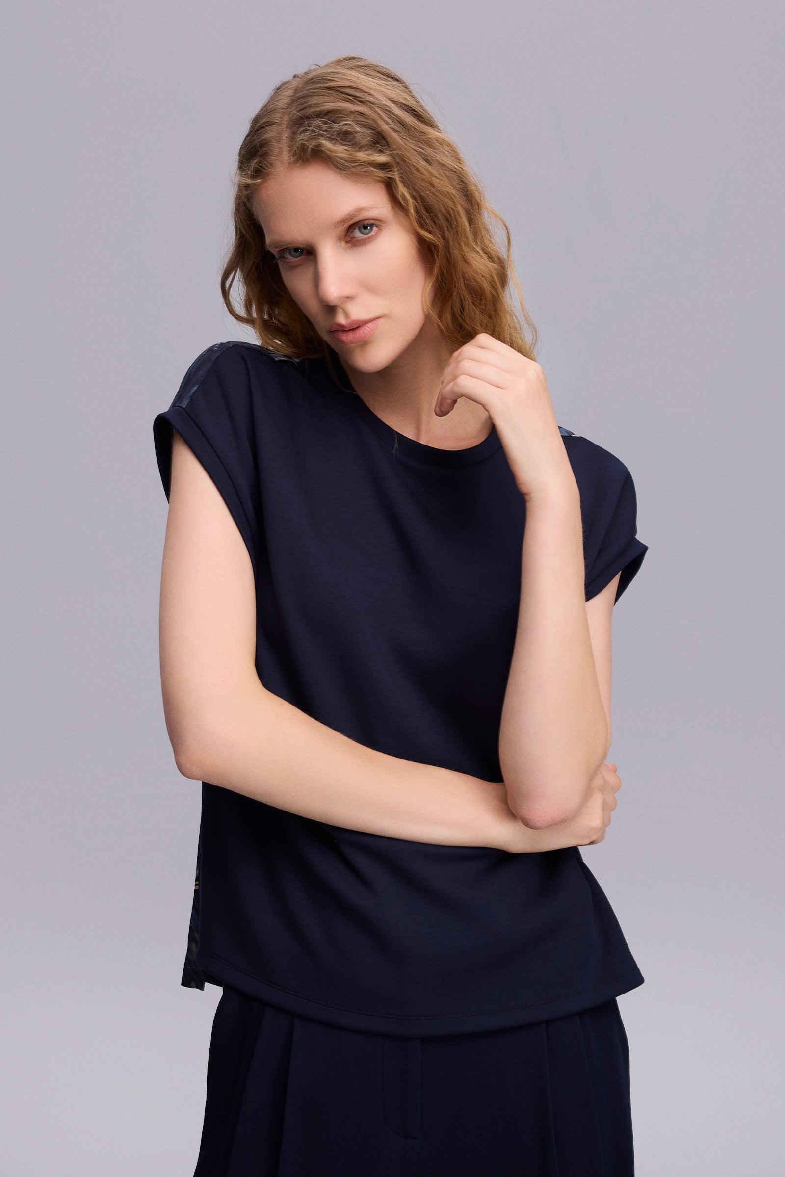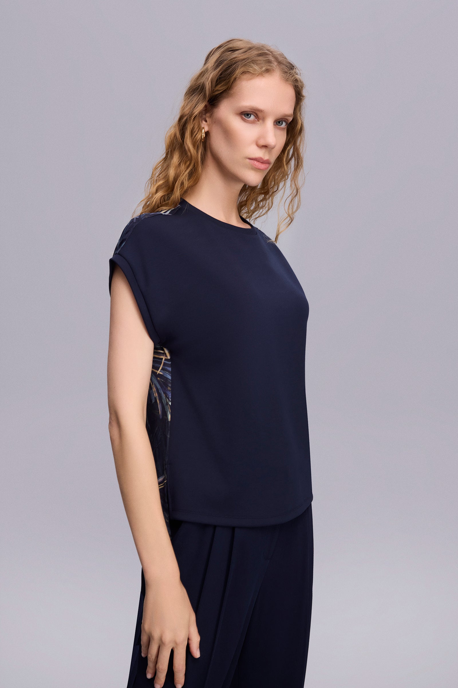 Kumaş Karışımlı Düşük Kollu Lacivert Bluz