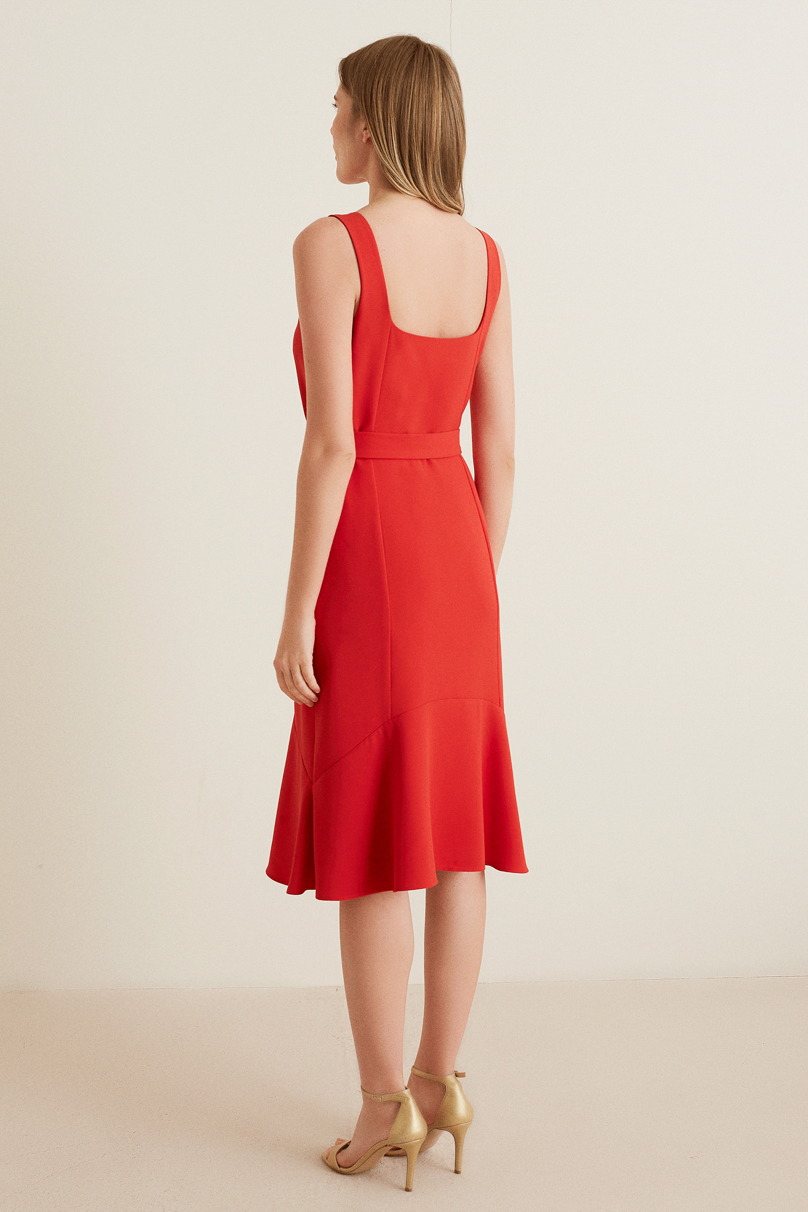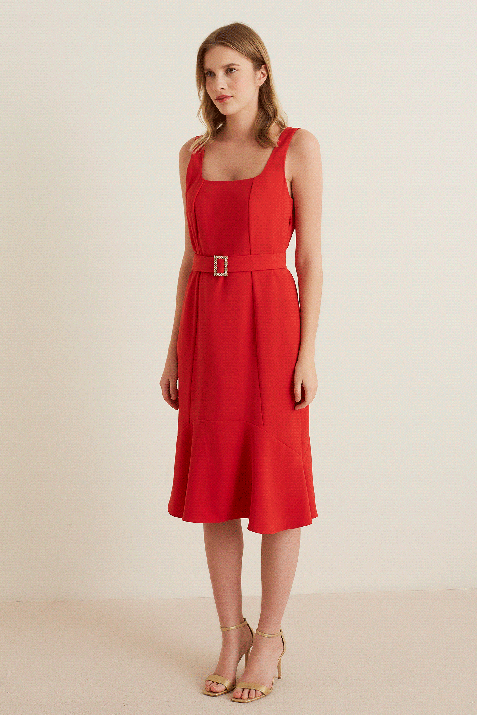 Kare Yaka Etek Ucu Fırfırlı Kemerli Elbise