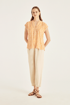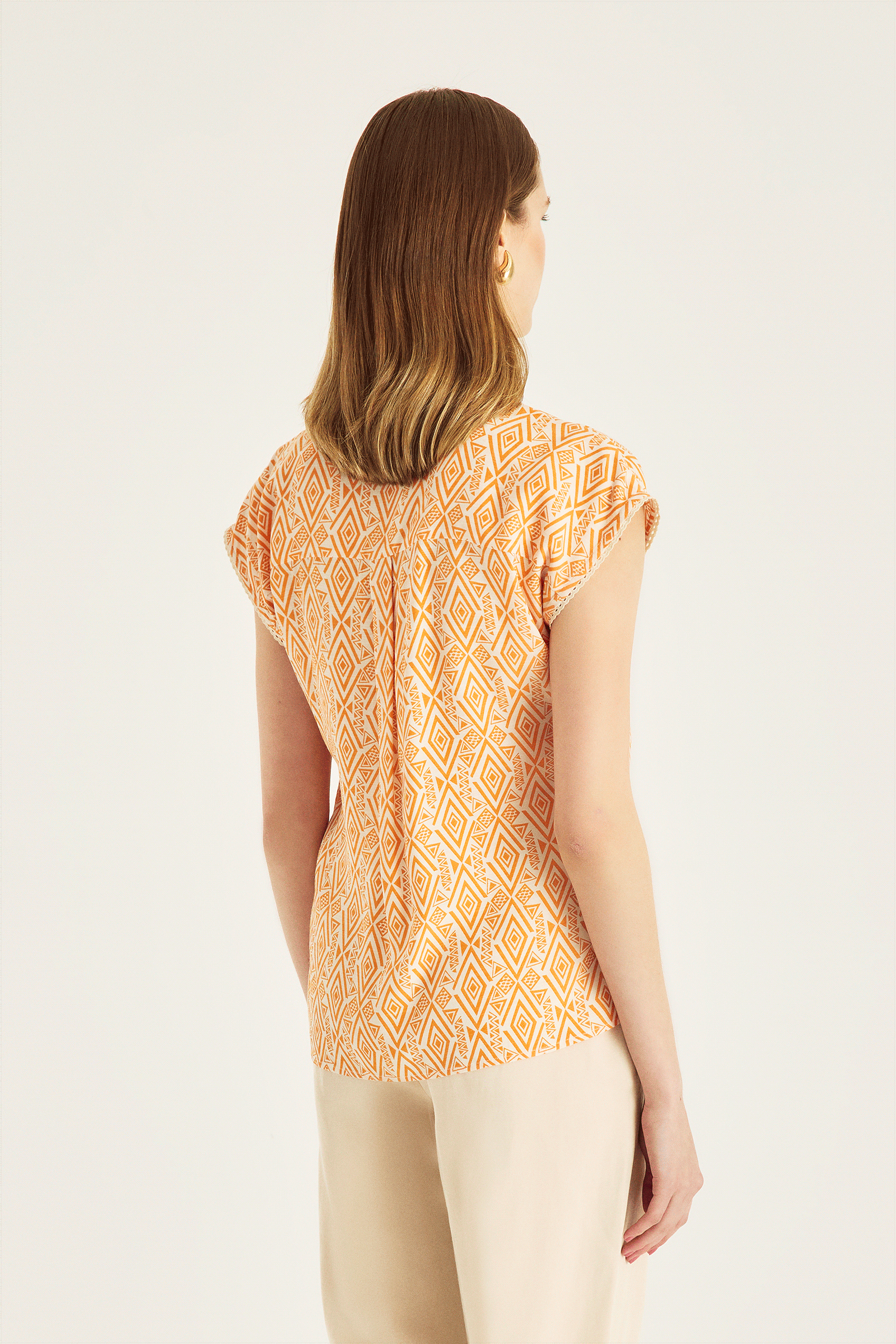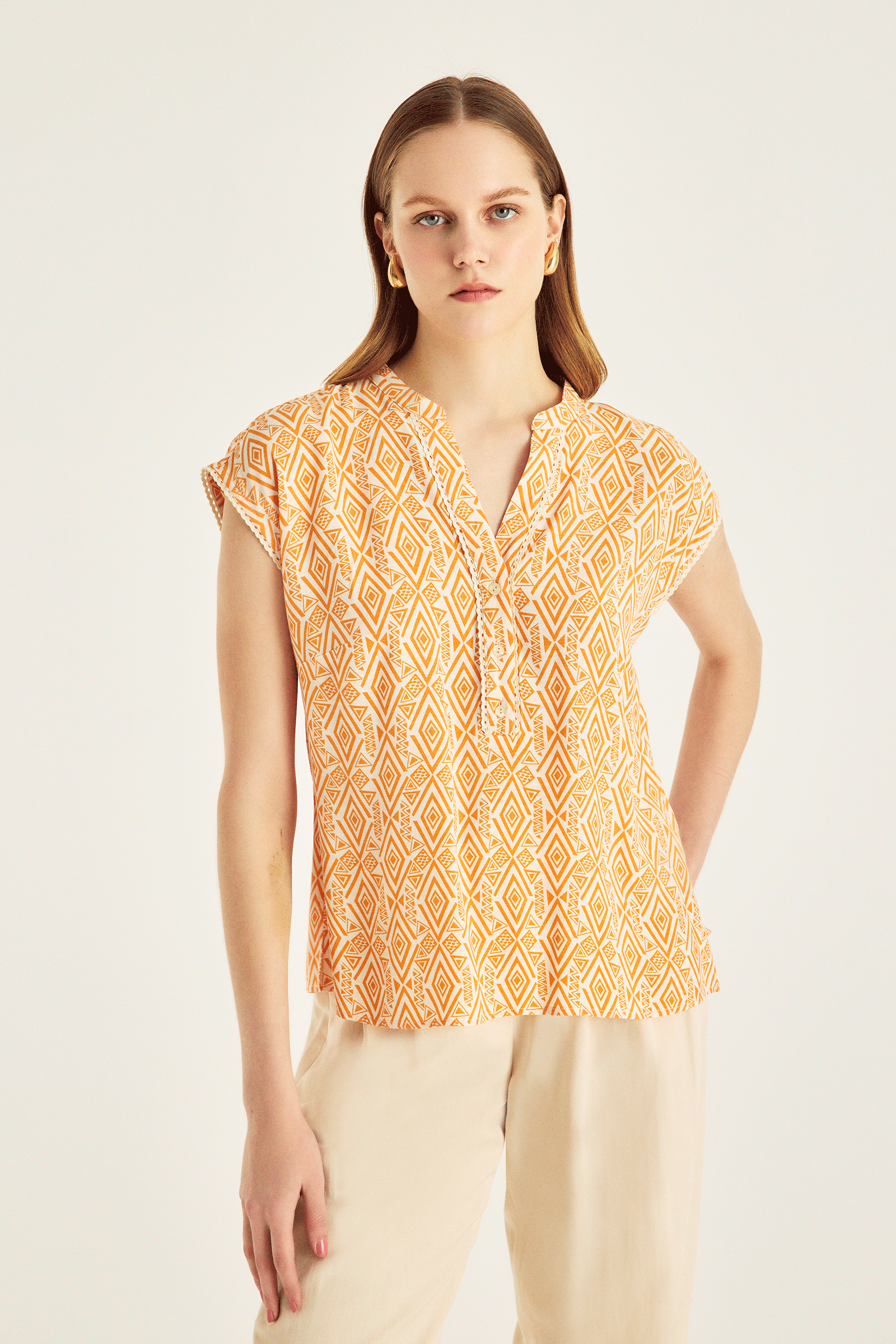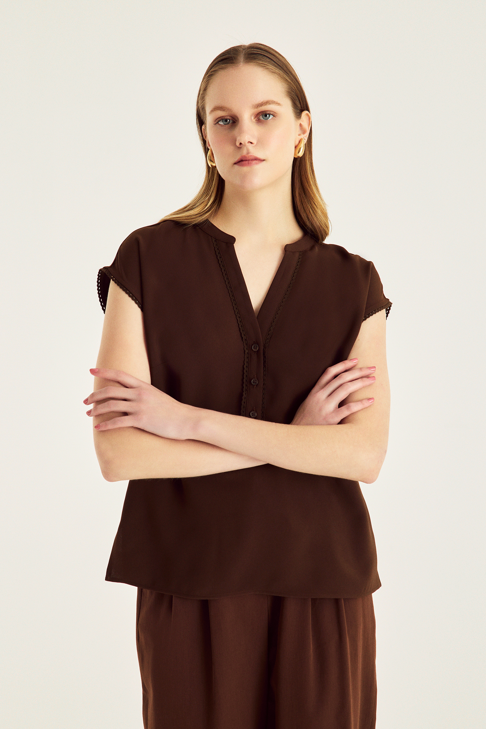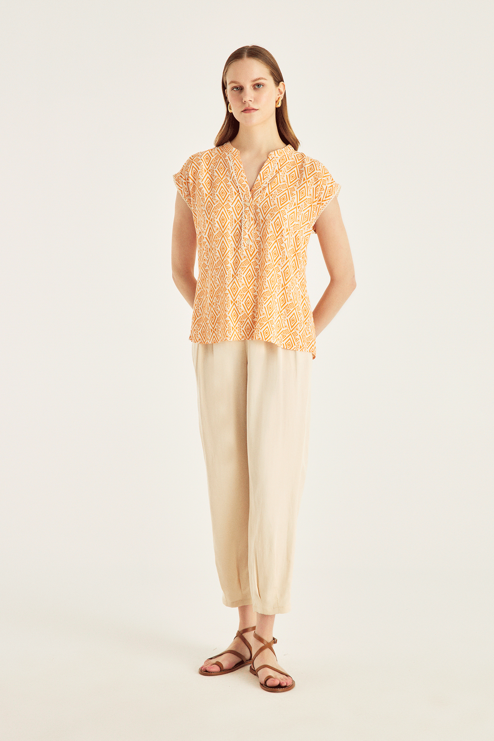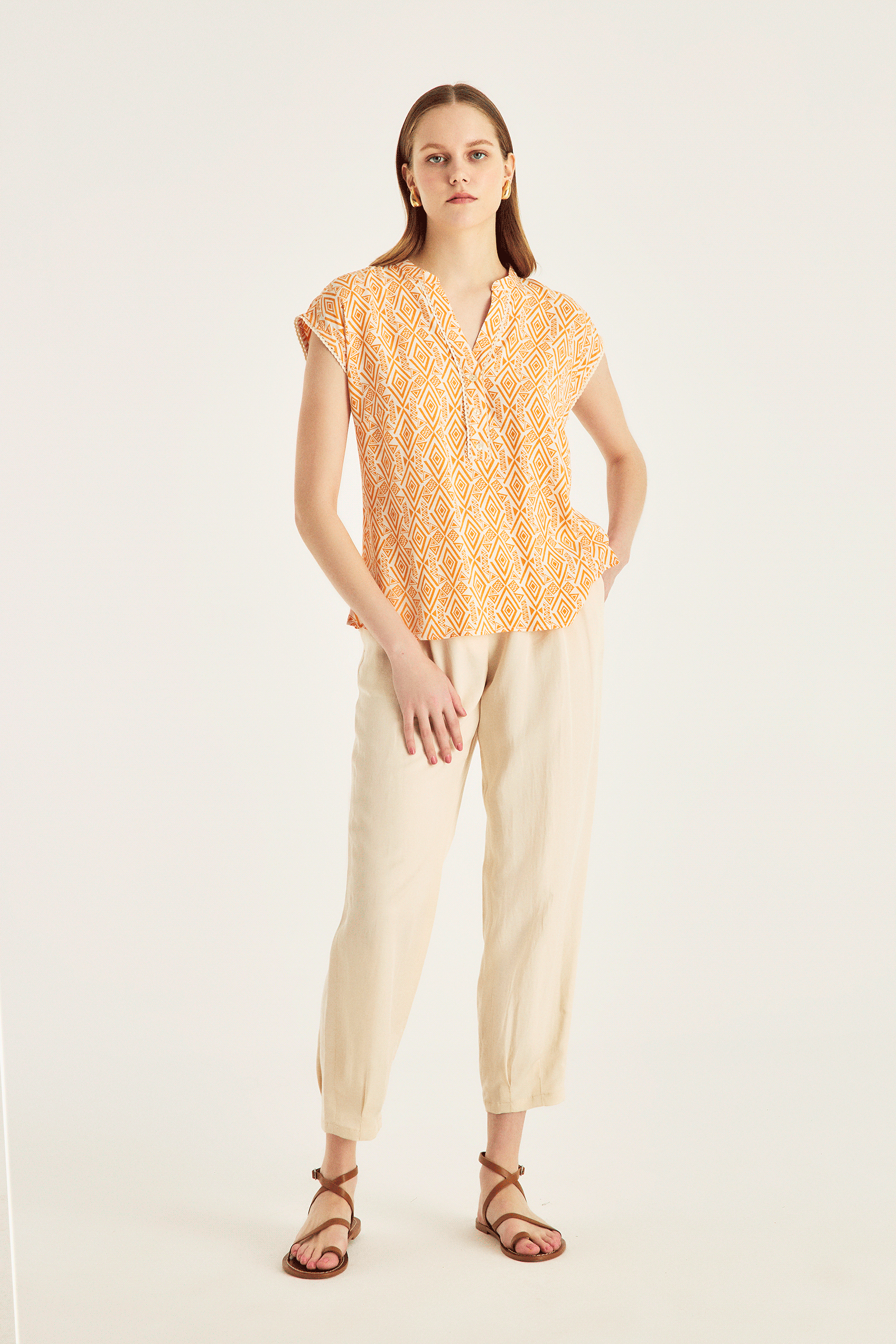 Şerit dantel detaylı bluz, etnik desenin enerjisini zarif dantel detaylarıyla dengeler. Hafif kumaşı ve akıcı formu, yaz stiline doğal bir şıklık katar.
