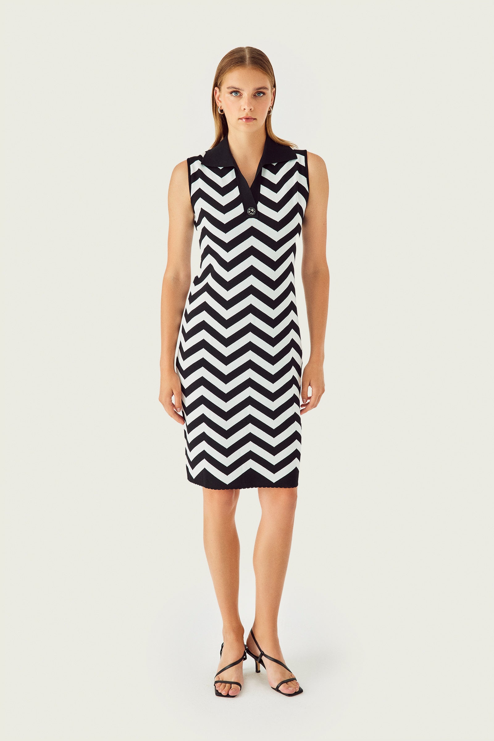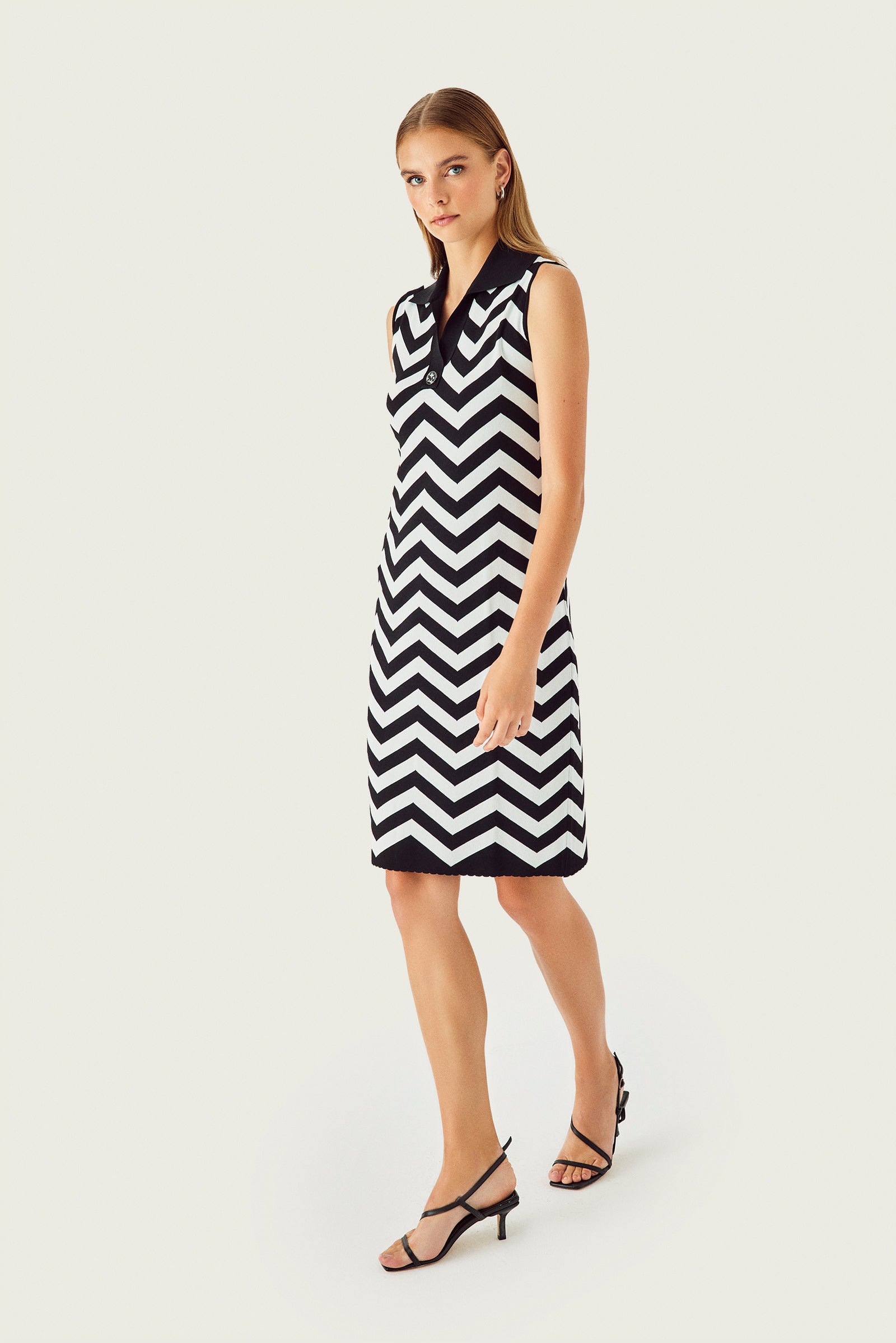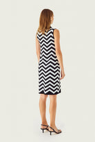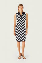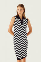Siyah Beyaz Zikzak Desenli Yaka Detaylı Elbise
