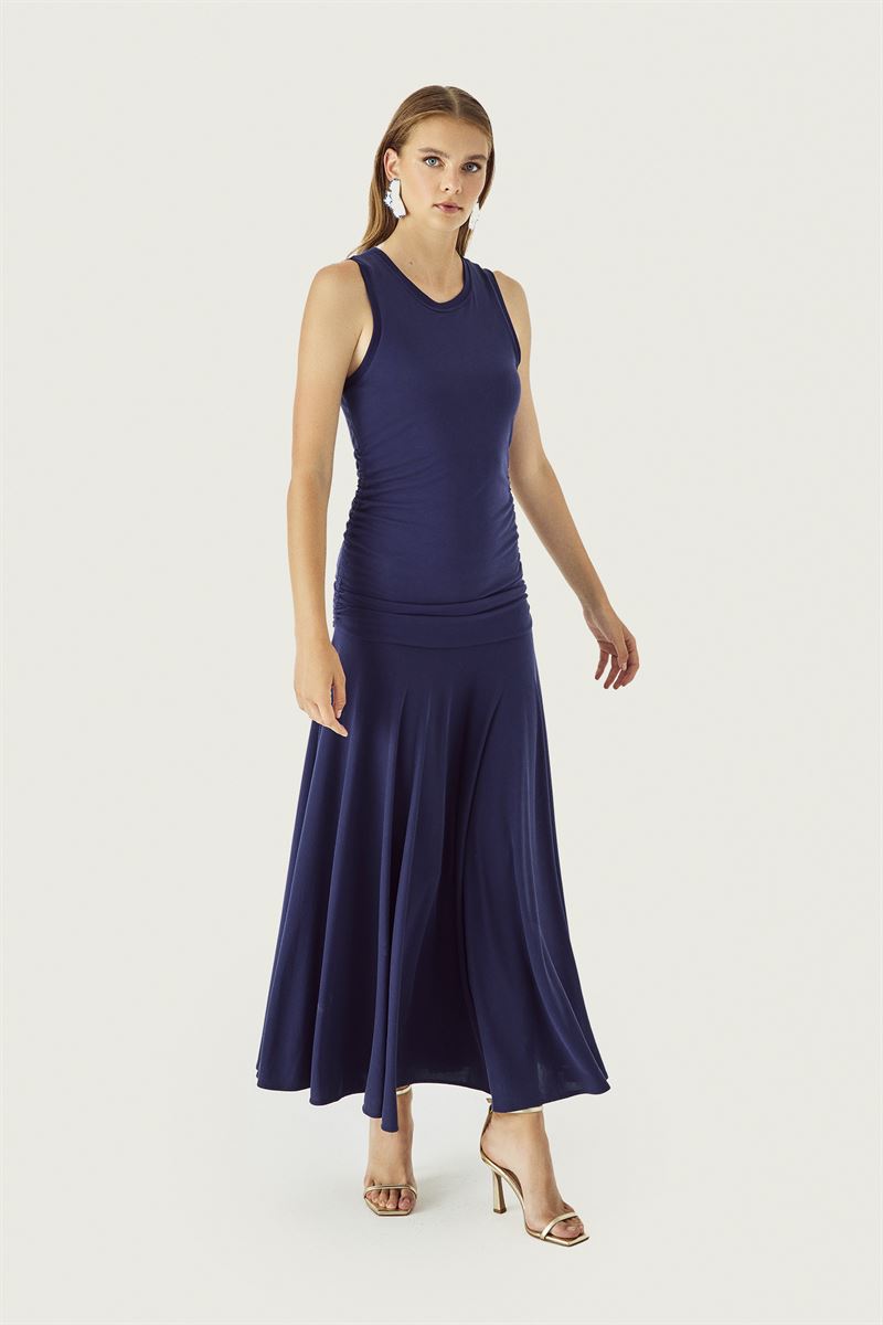 Büzgü Detaylı Eteği Volanlı Lacivert Uzun Örme Elbise