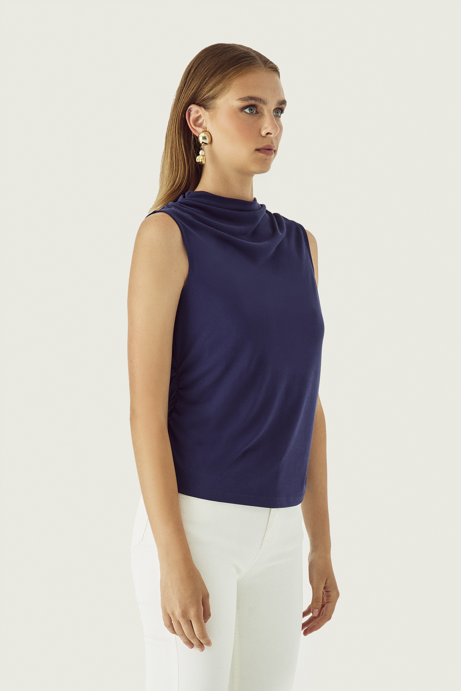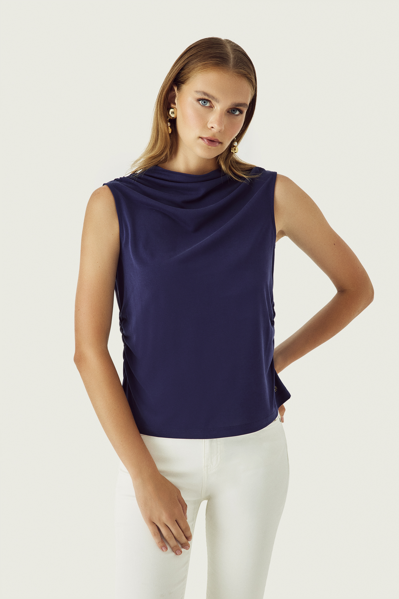 Omuzları Büzgülü Kolsuz Lacivert Örme Bluz