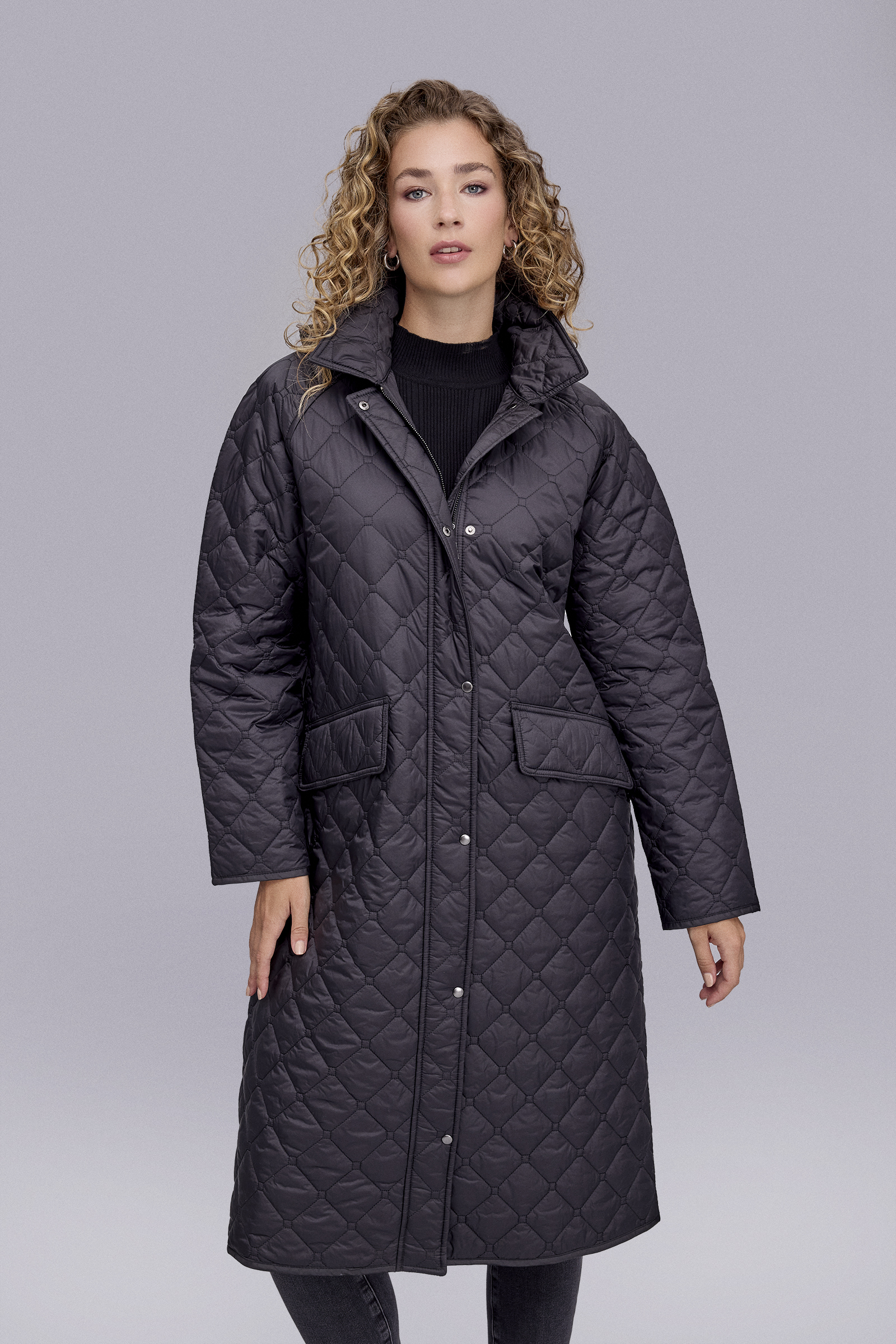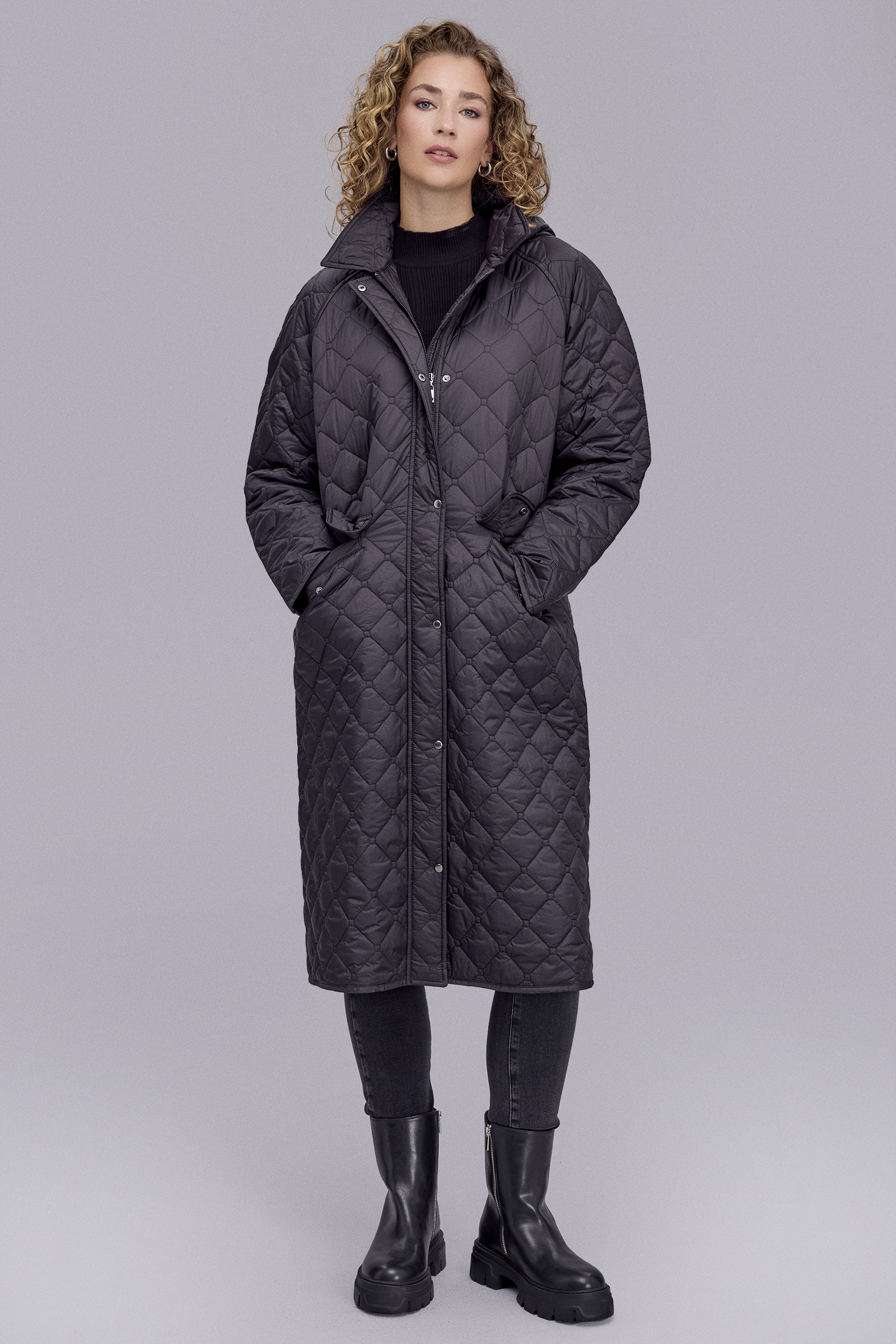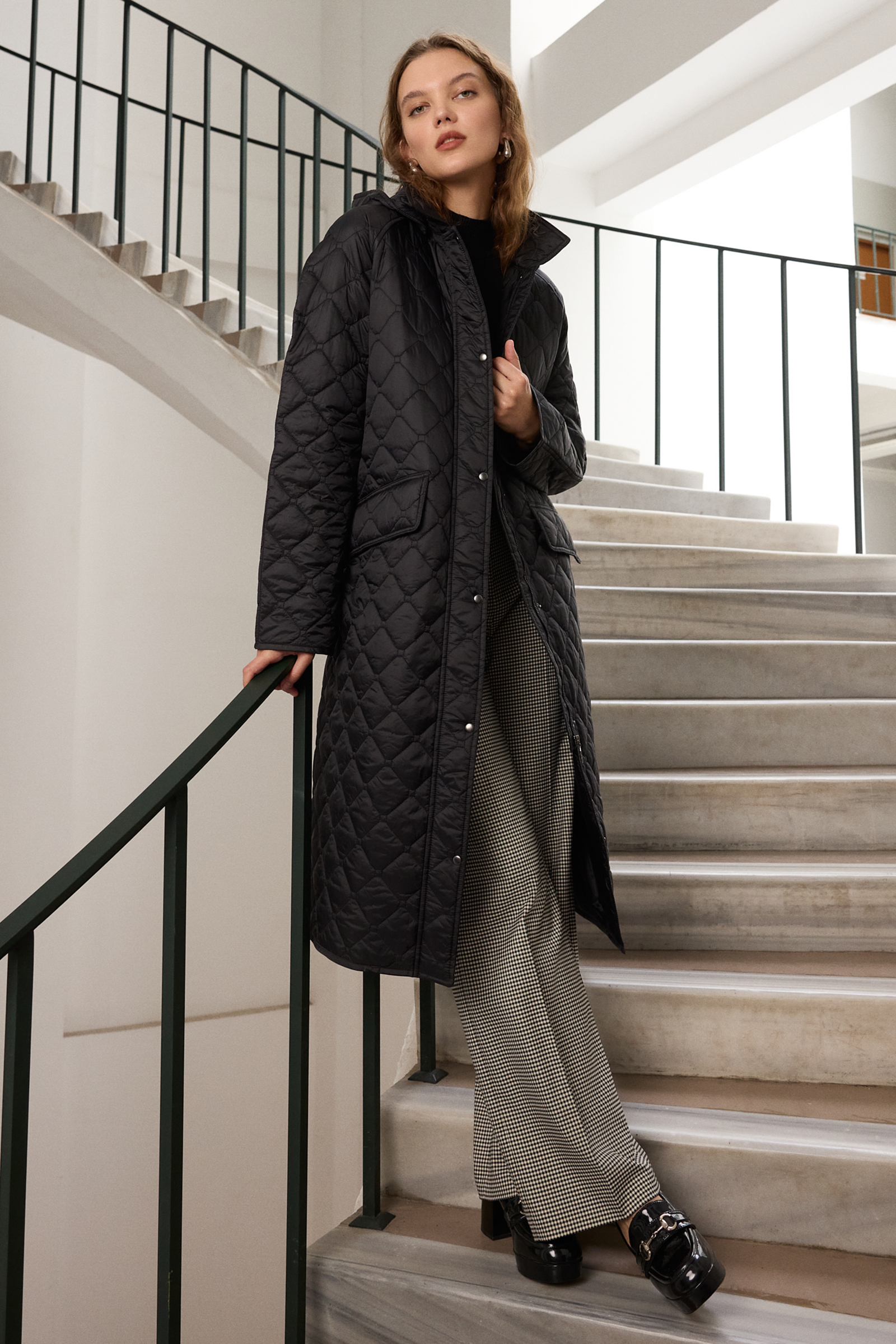 Kapitone Kapüşonlu Uzun Siyah Mont