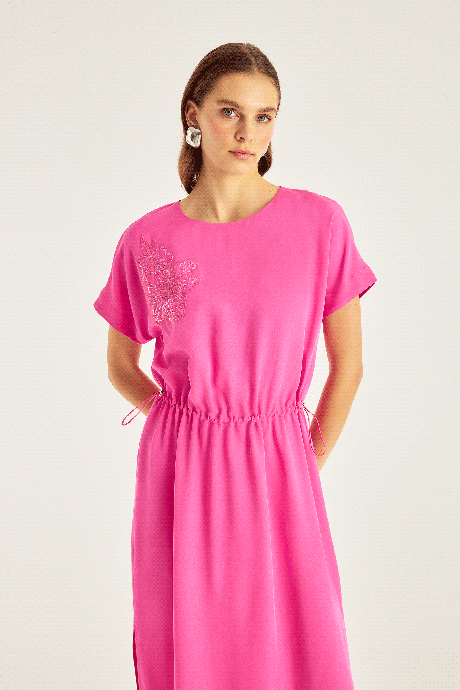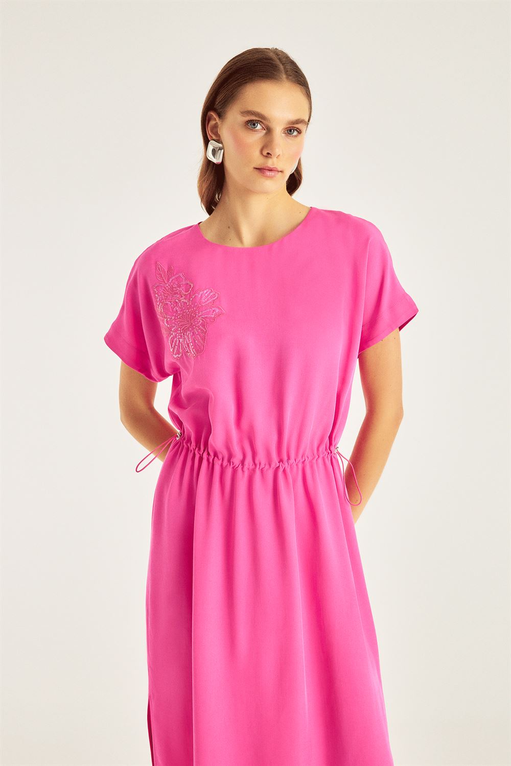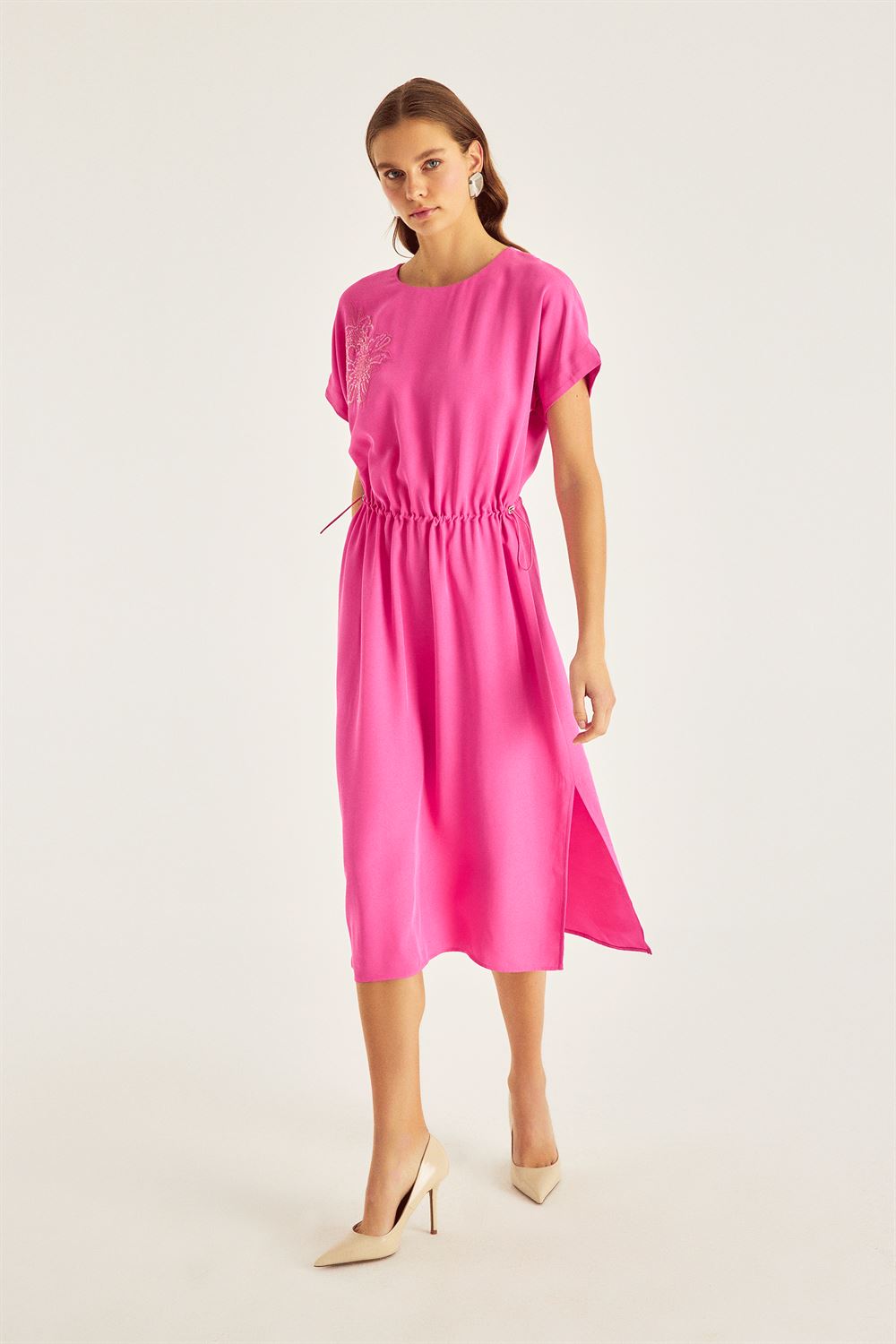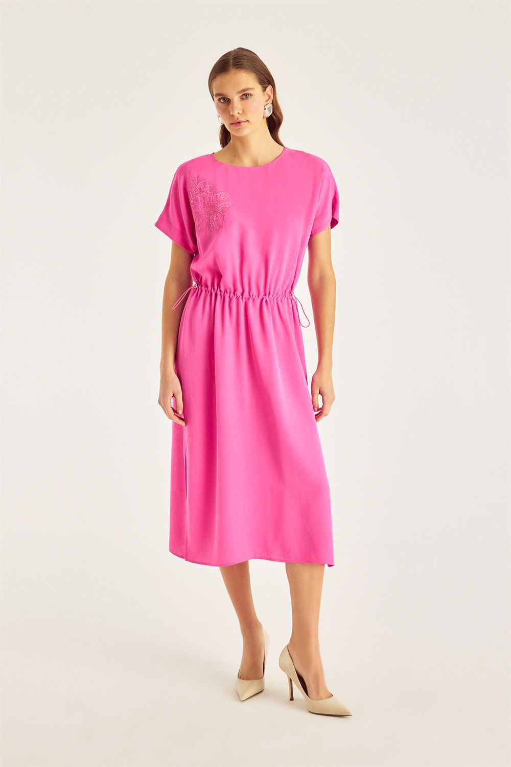 Nakış Detaylı Beli Büzgülü Midiboy Elbise