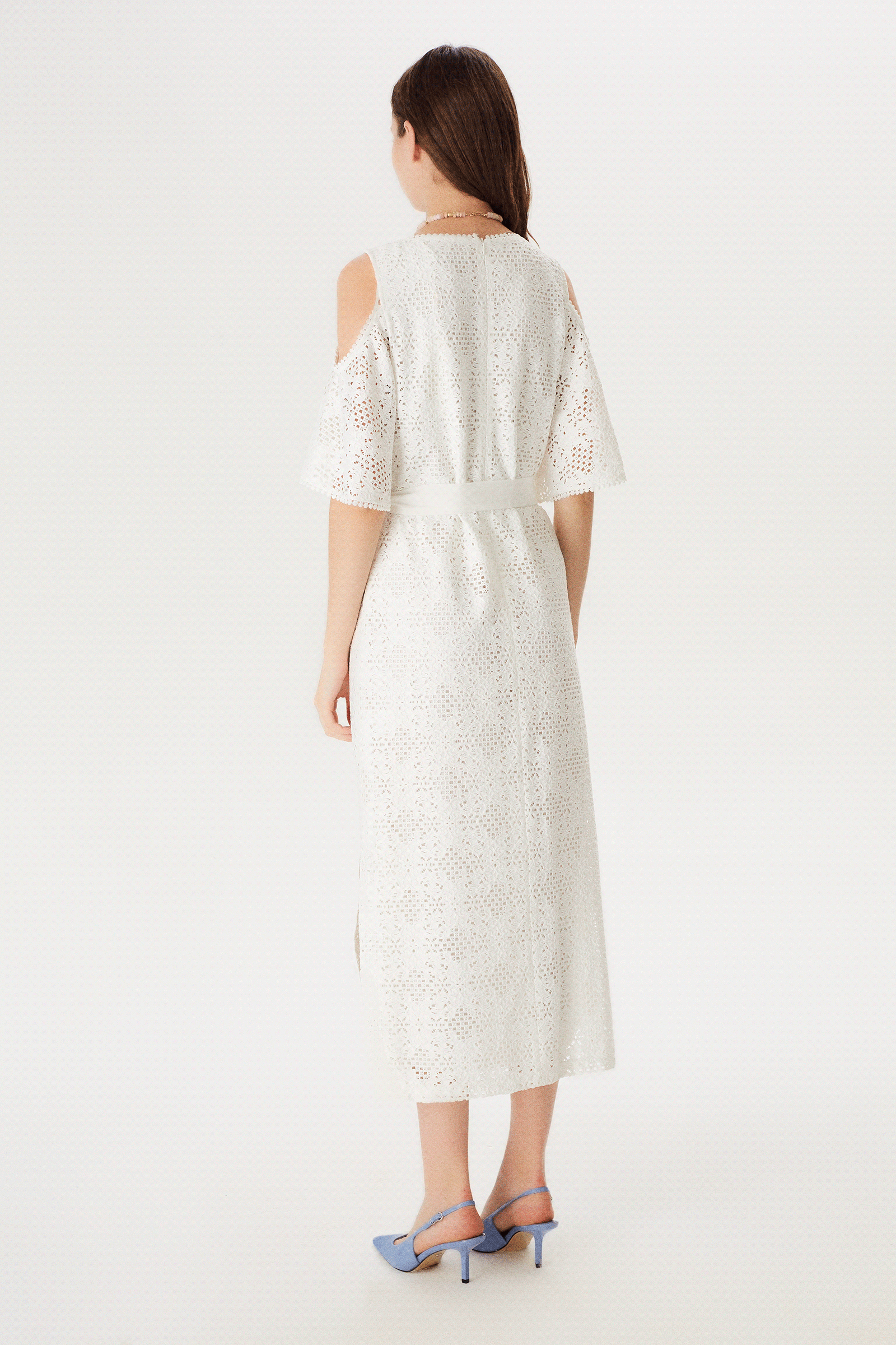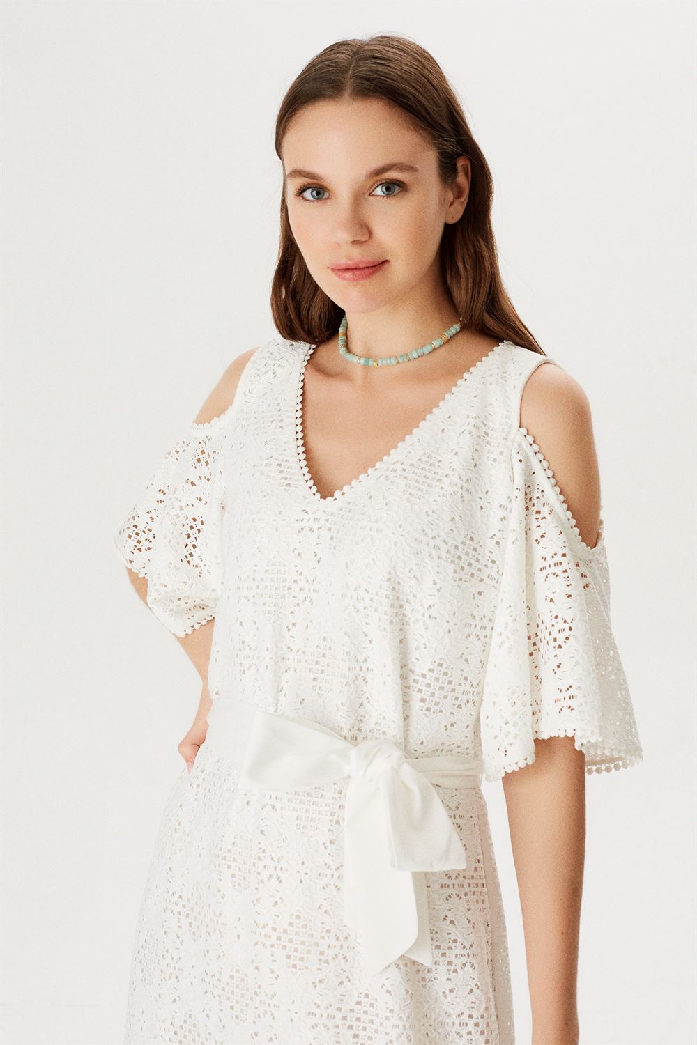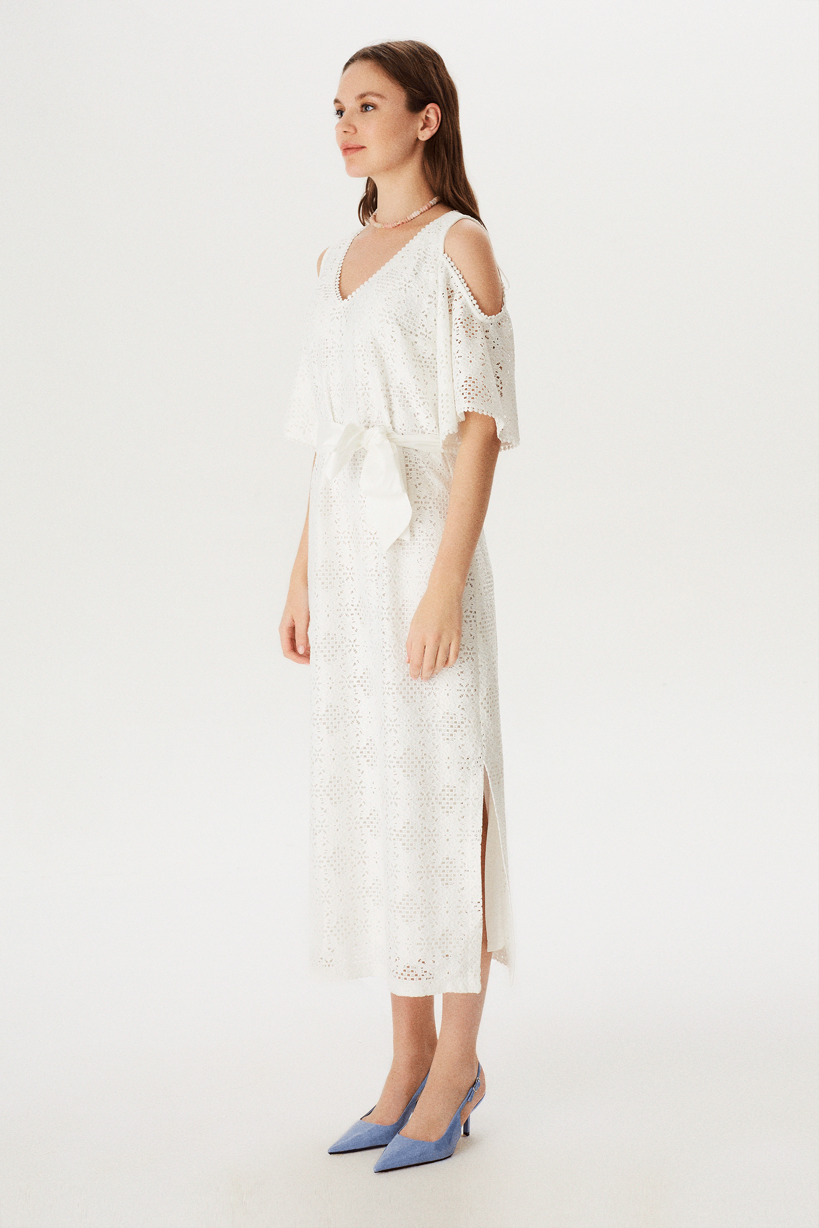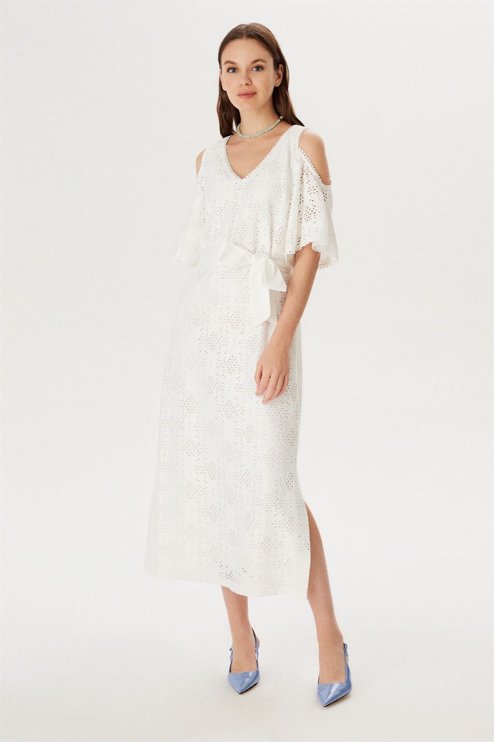 Omuz Dekolteli Yanları Yırtmaçlı Maxi Dantel Elbise