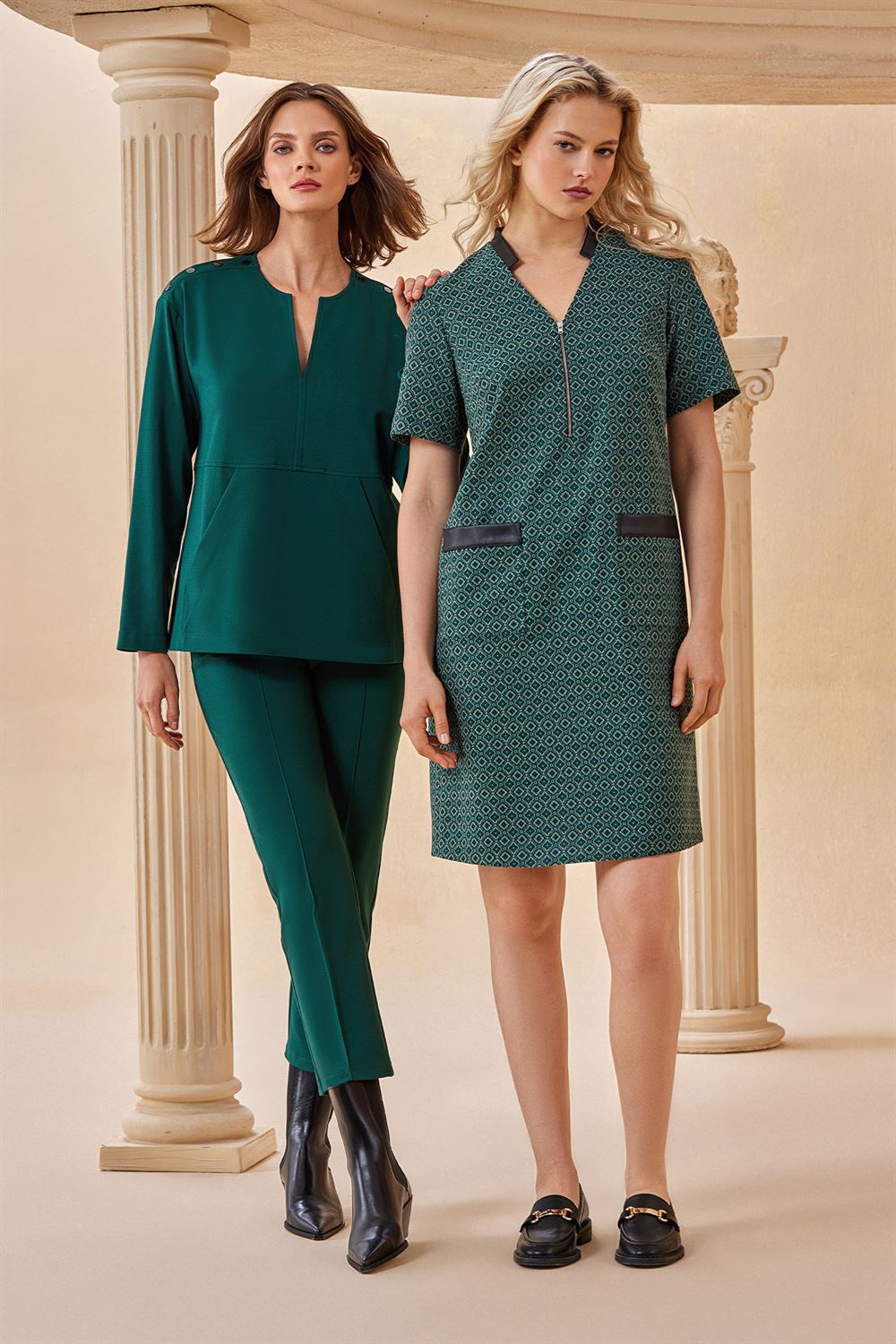 | Kumaş İçeriği | %65 Polyester, %32 Viskon, %3 Elastan | %56 Polyester, %40 Pamuk, %4 Elastan |