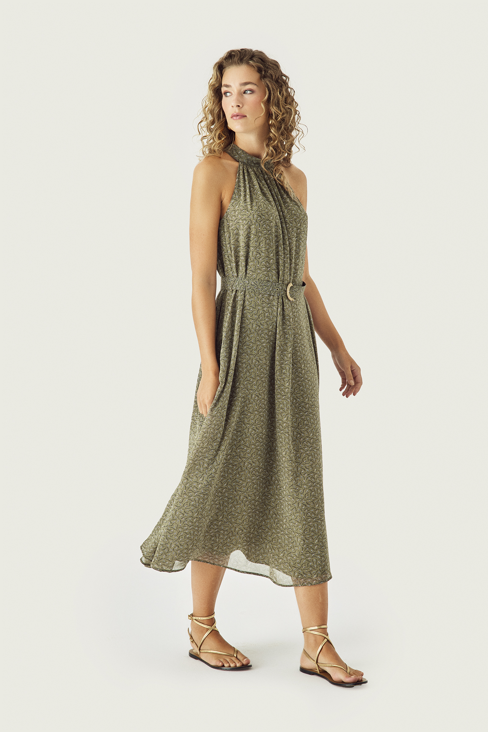 Halter Yaka Midi Boy Desenli Elbise