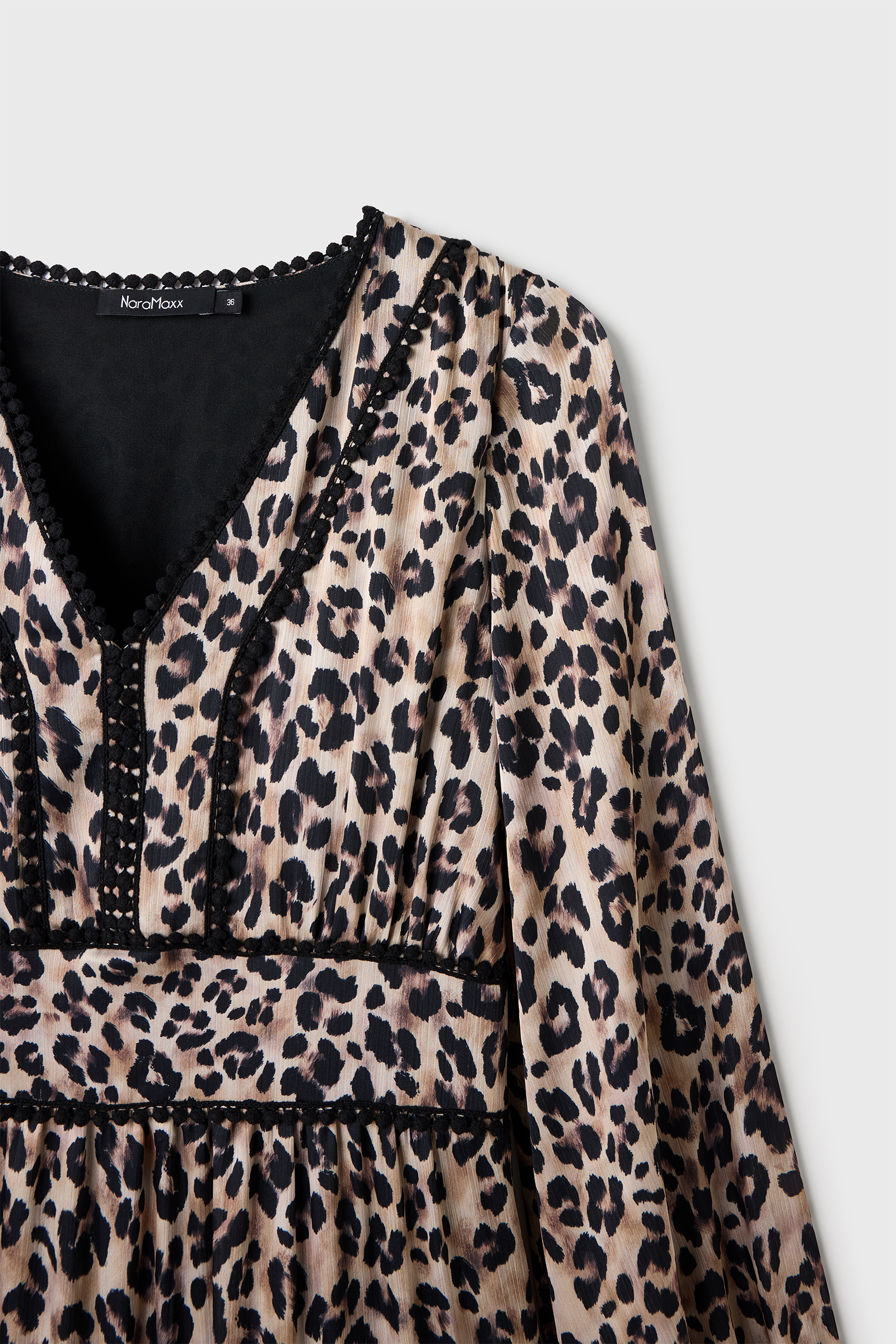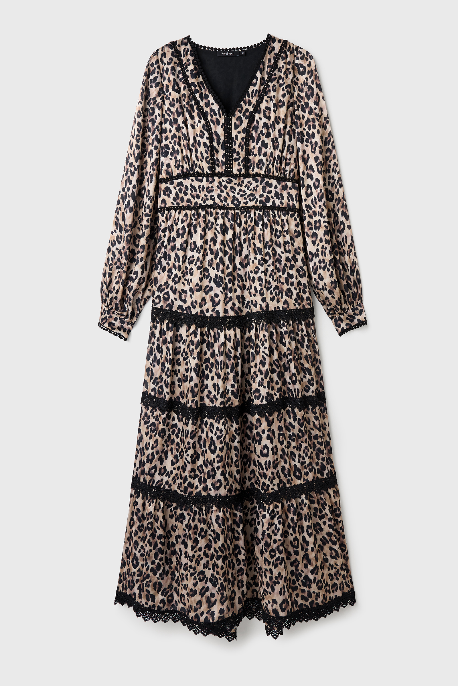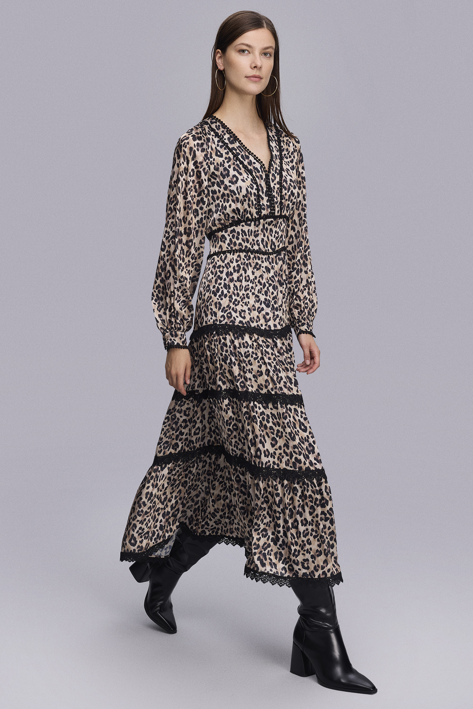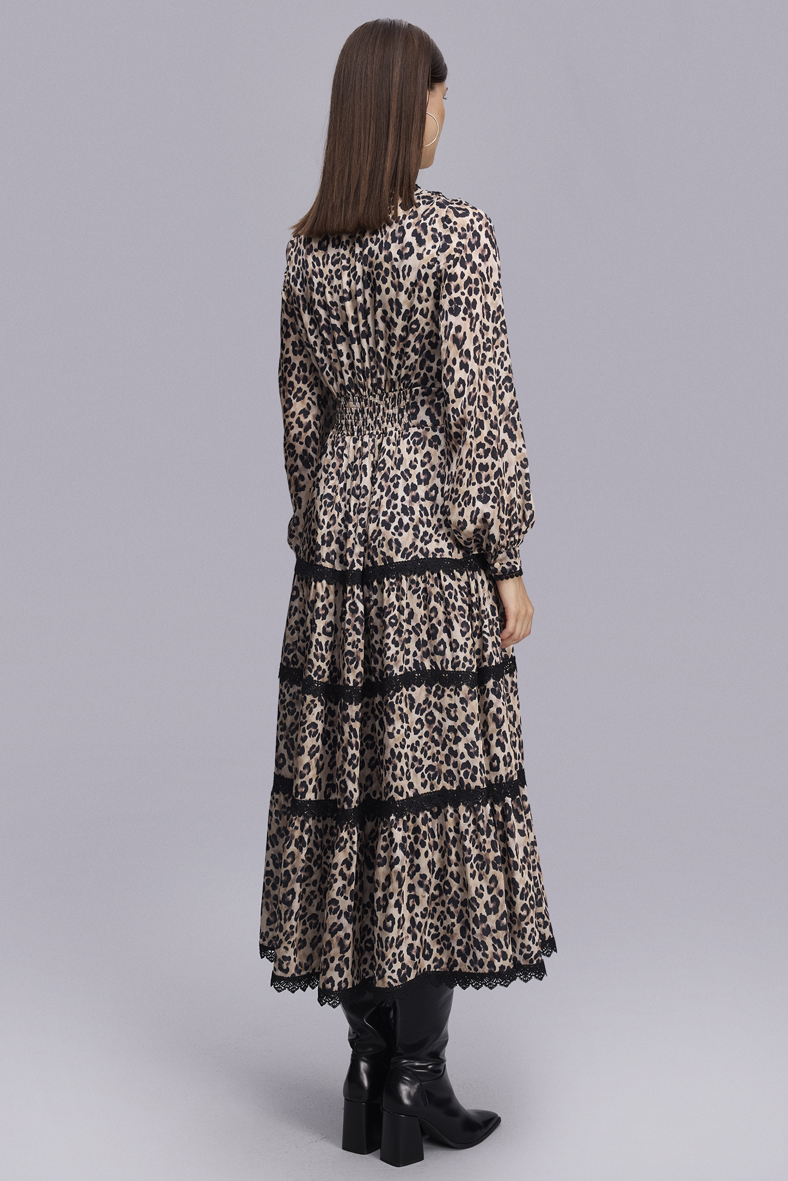 Fırfırlı Midi Boy Leopar Desen Elbise