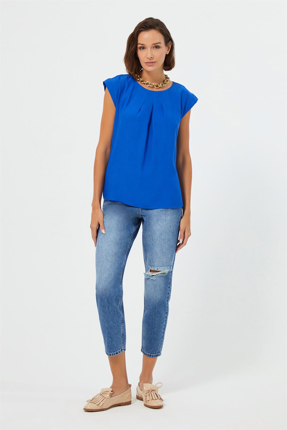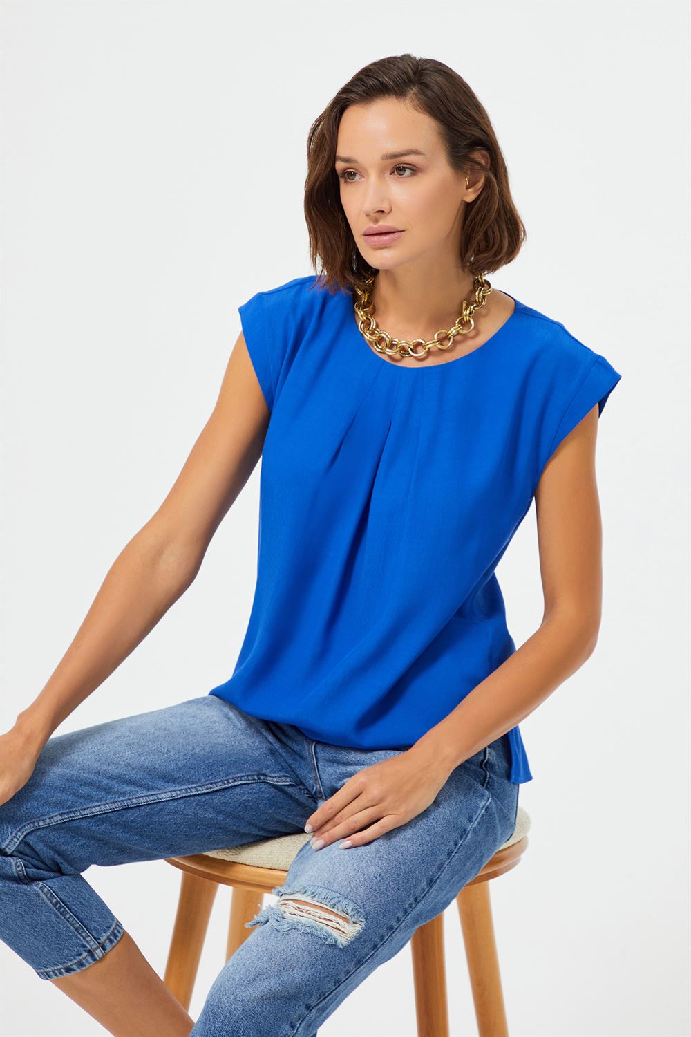Pile Detaylı Düşük Kollu Bluz