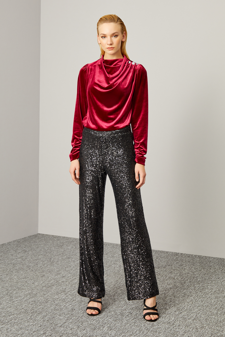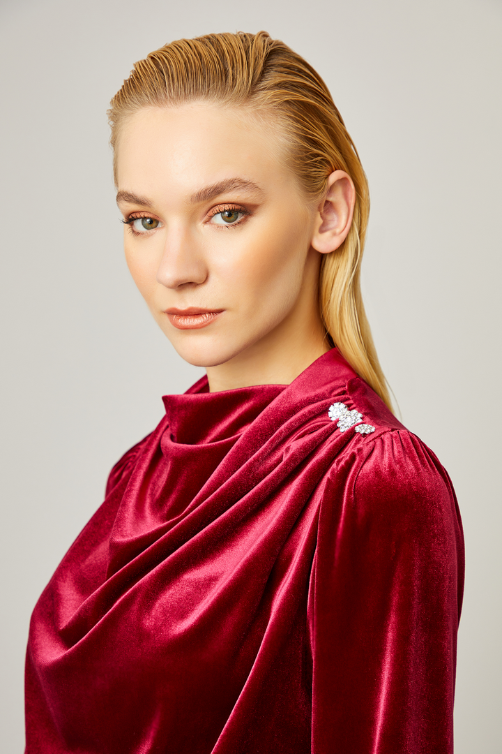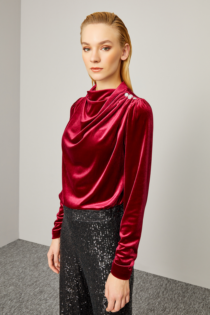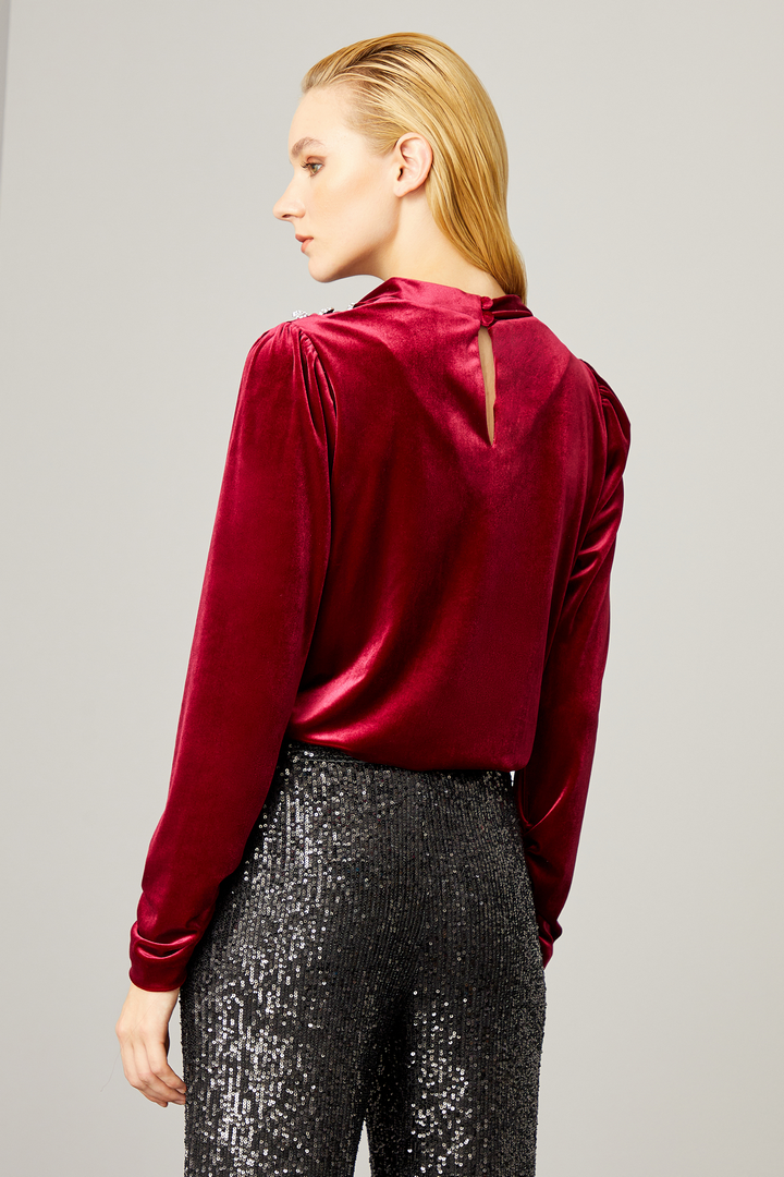 Dantel Kumaş Karışımlı Bordo Kadife Bluz