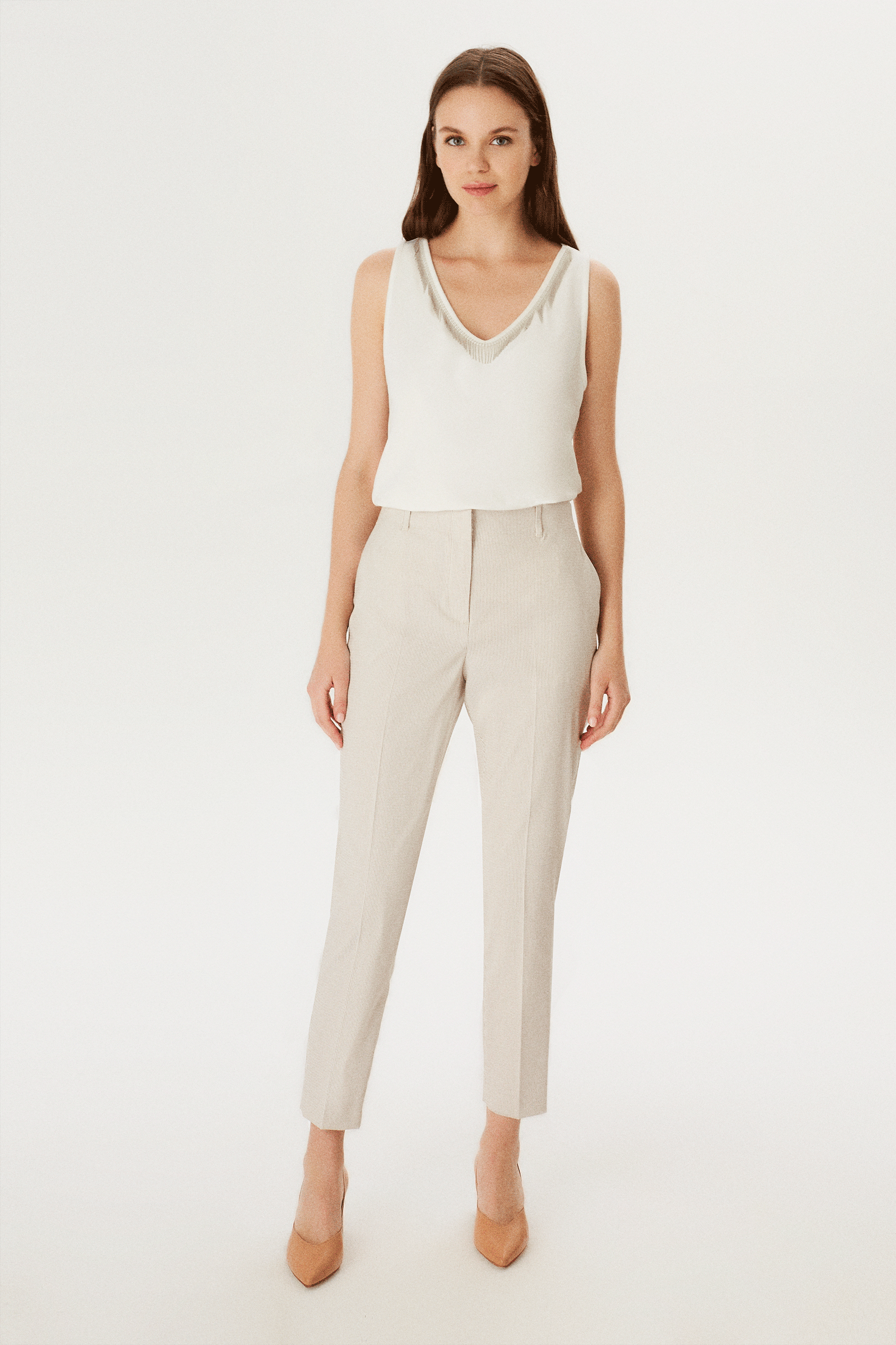 Beli Kemerli Çizgili Düz Paça Pantolon