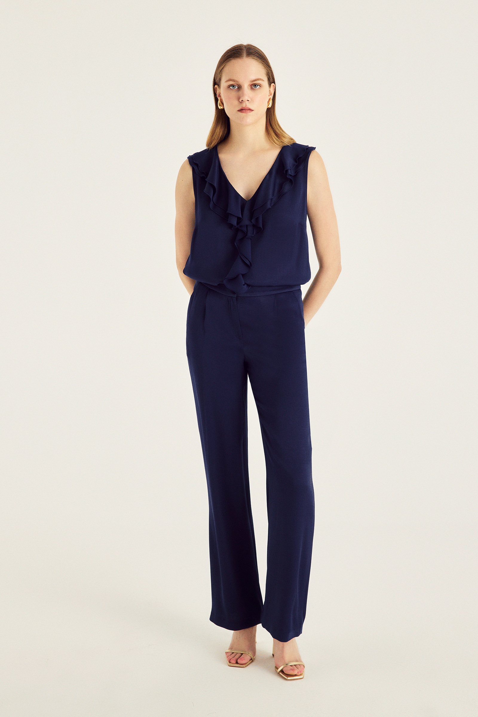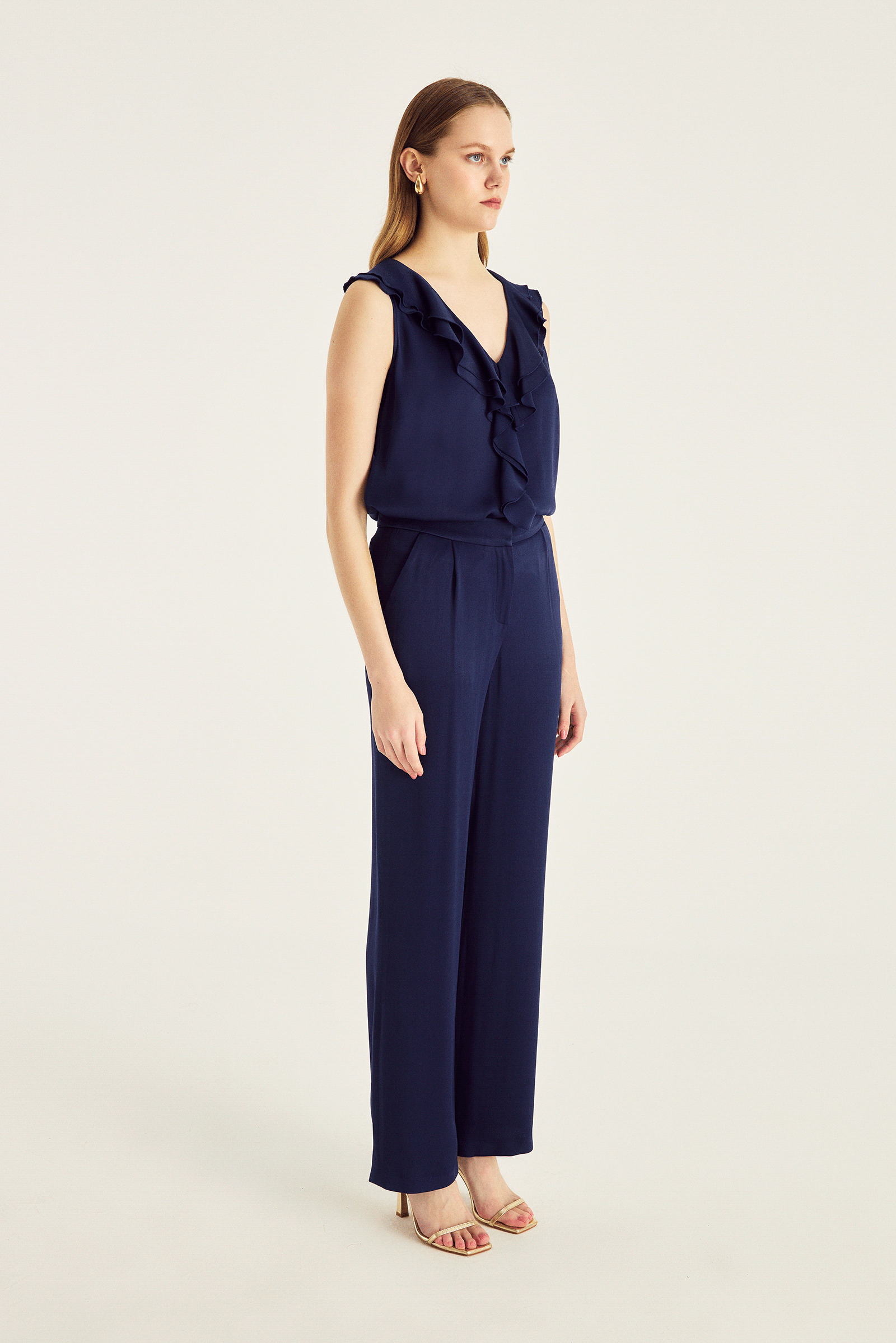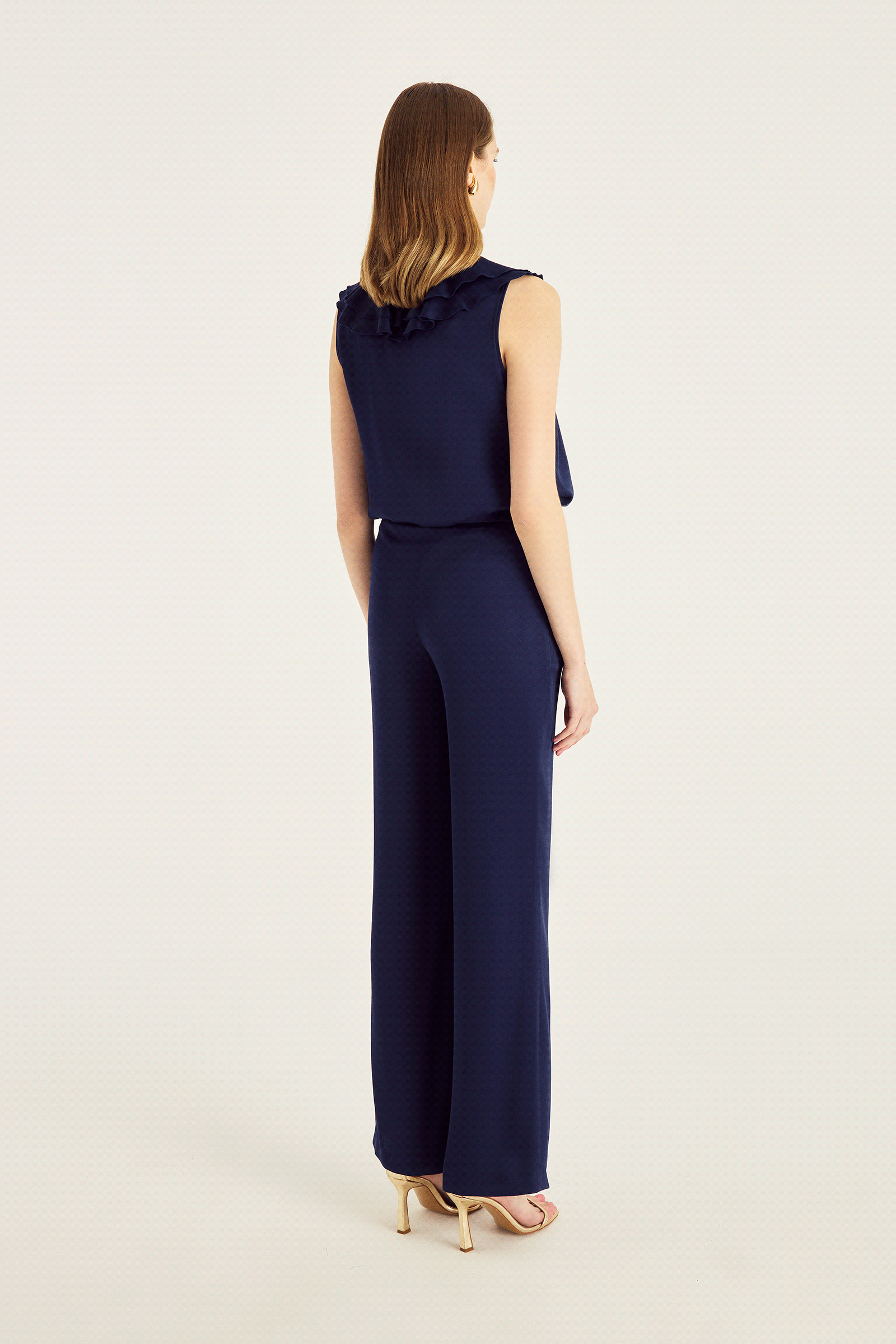Pile Detaylı Lacivert Bol Paça Pantolon