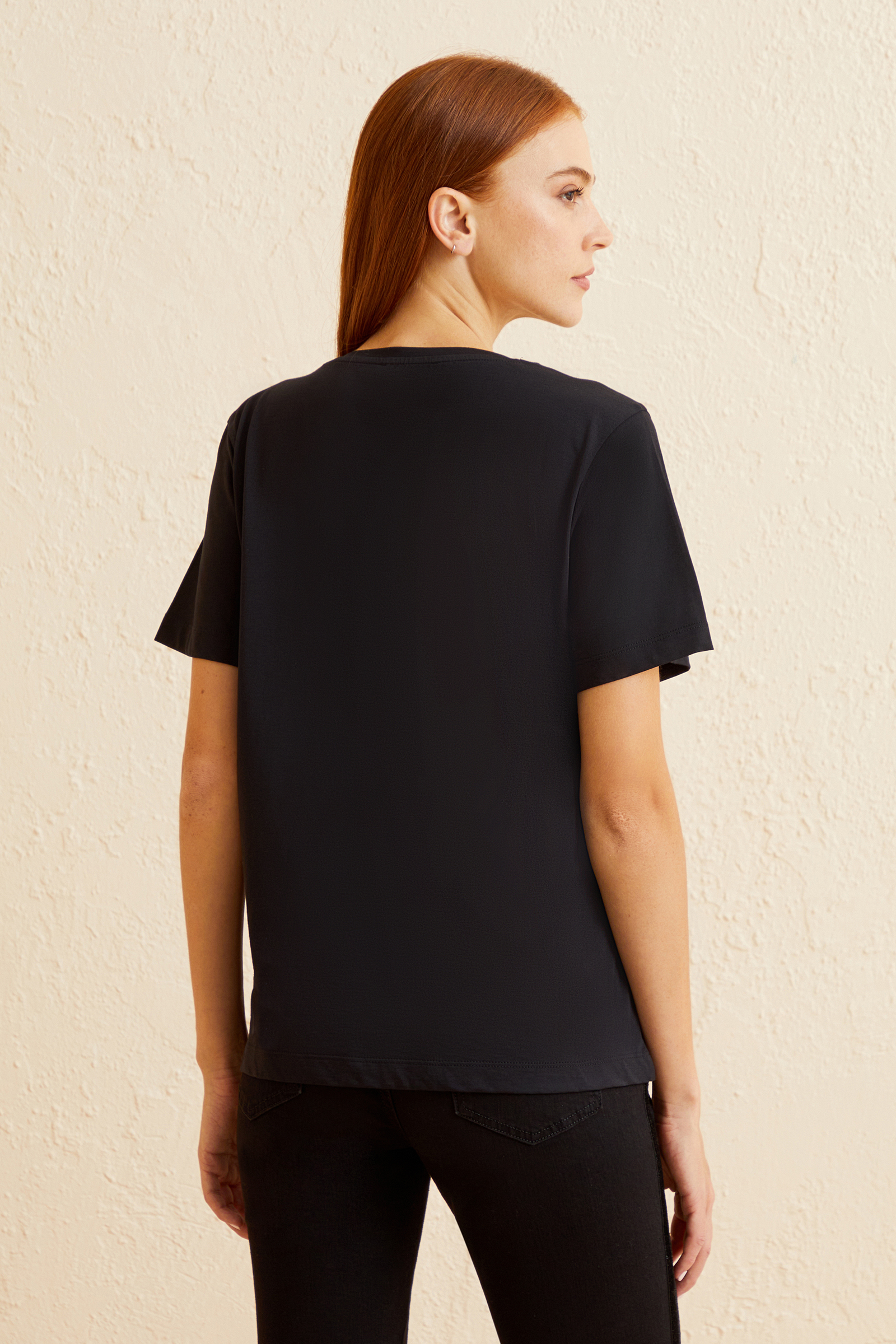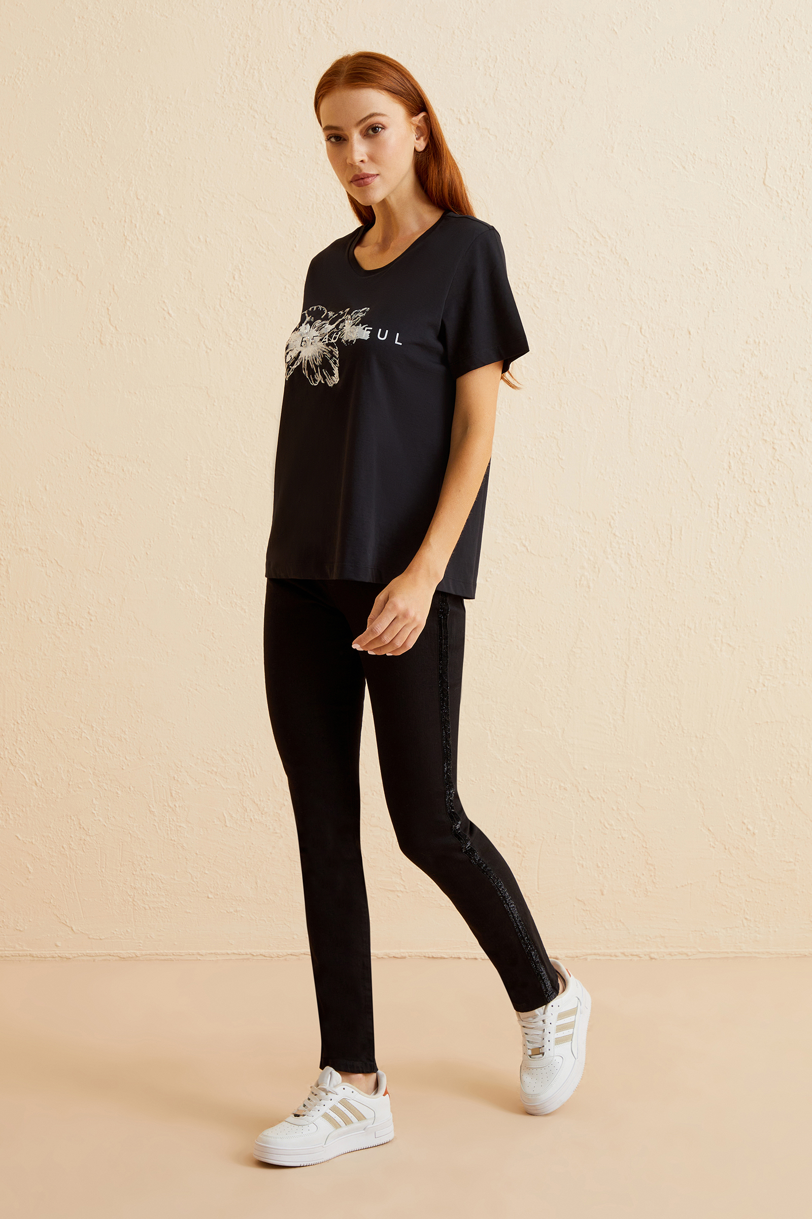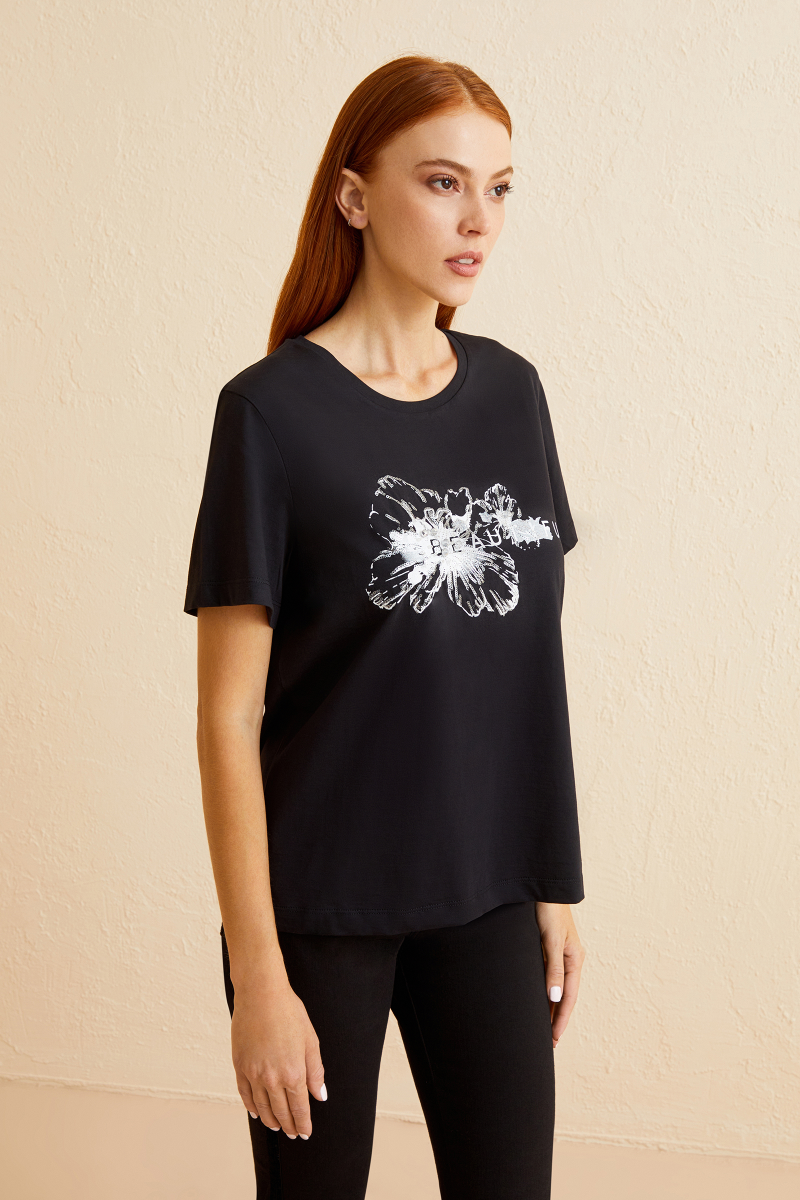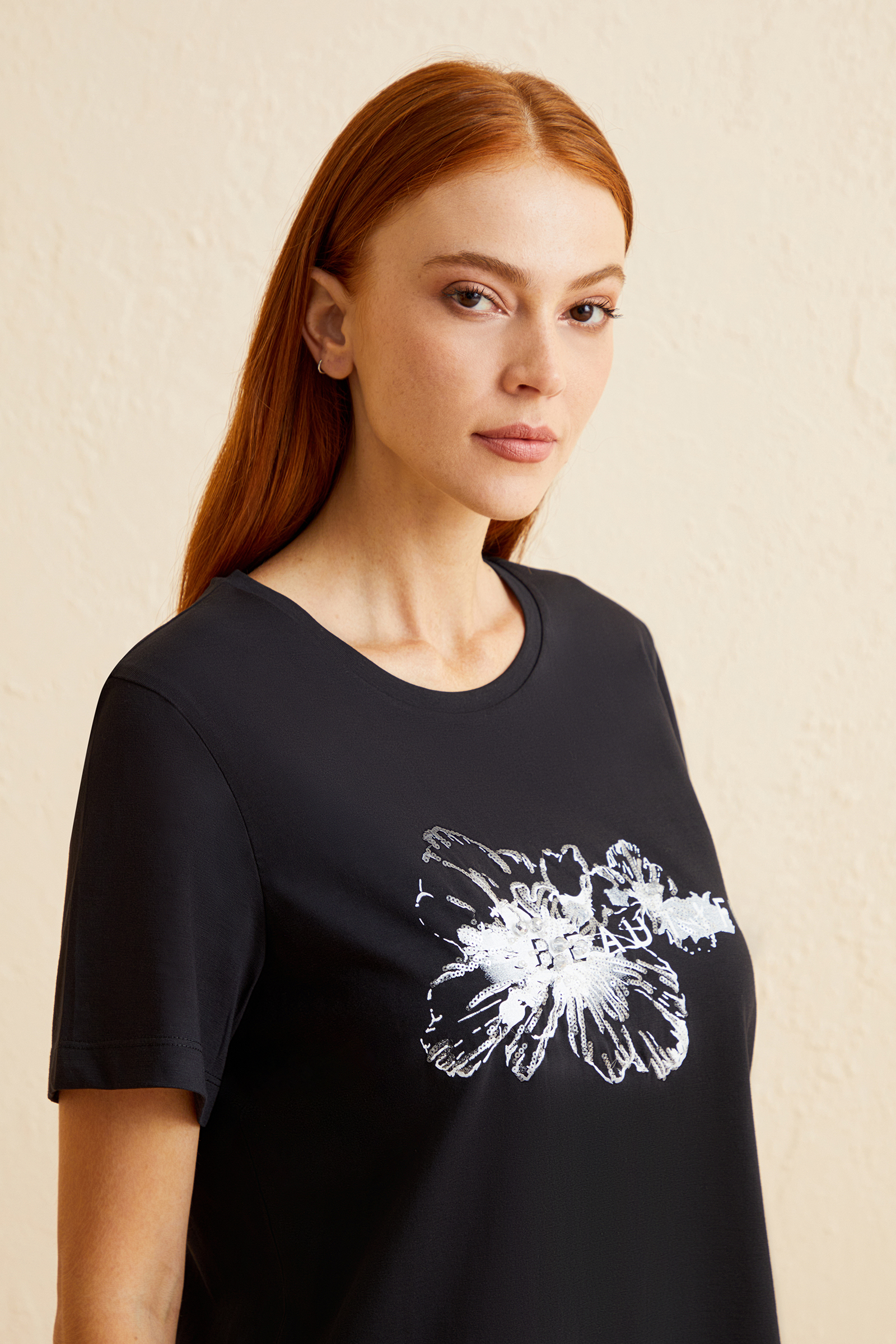 Üzeri Çiçek Desenli Siyah T-Shirt