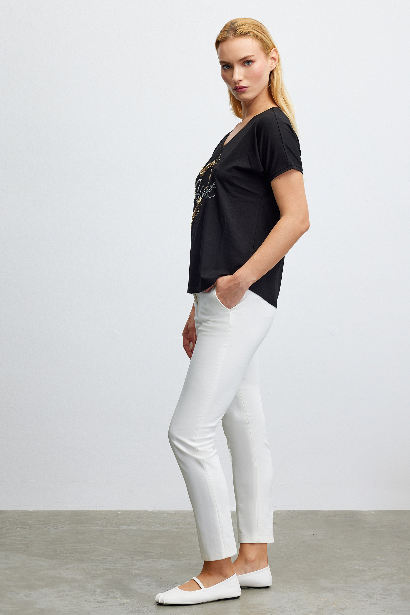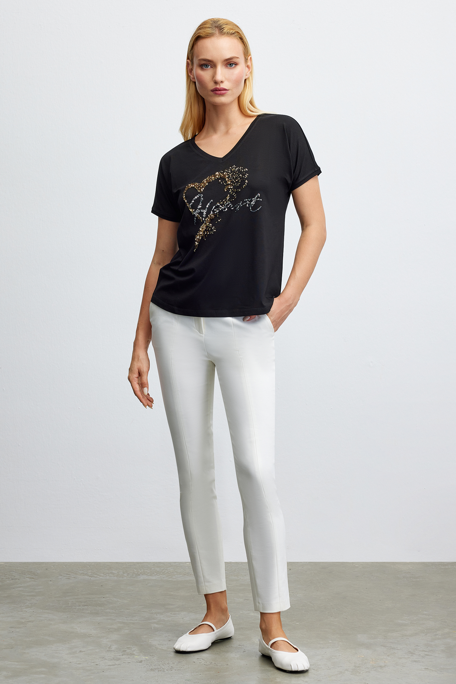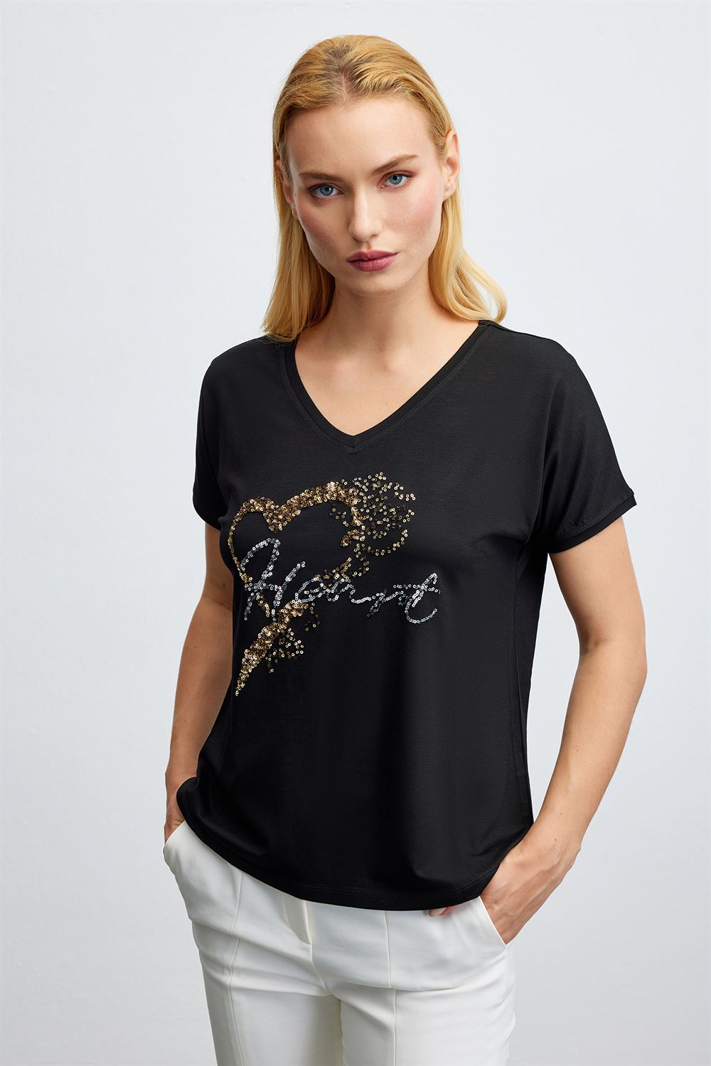Pul İşlemeli V Yaka T-Shırt