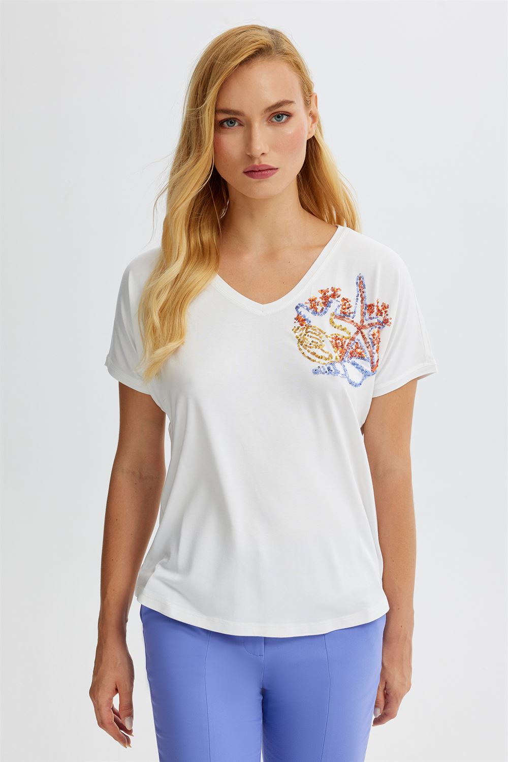 Pul İşlemeli V Yaka T-Shırt